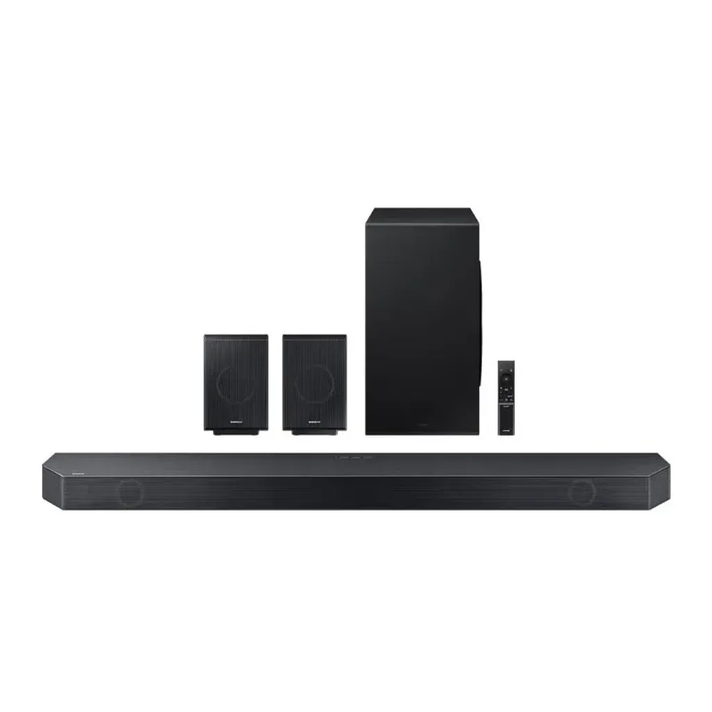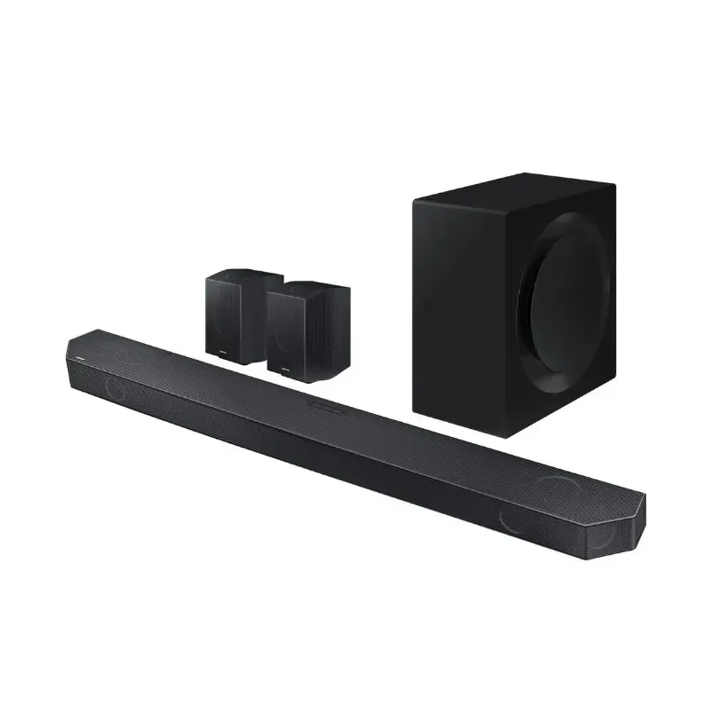 The Samsung 11.1.4 Channel Premium Q-Series Soundbar comes with a wireless subwoofer, and up-firing rear speakers, to create theater-quality sound, in the comfort of your home. You can explore the depths of sound with Dolby Atmos and DTS:X, technology that will highlight sound as it flows around you.