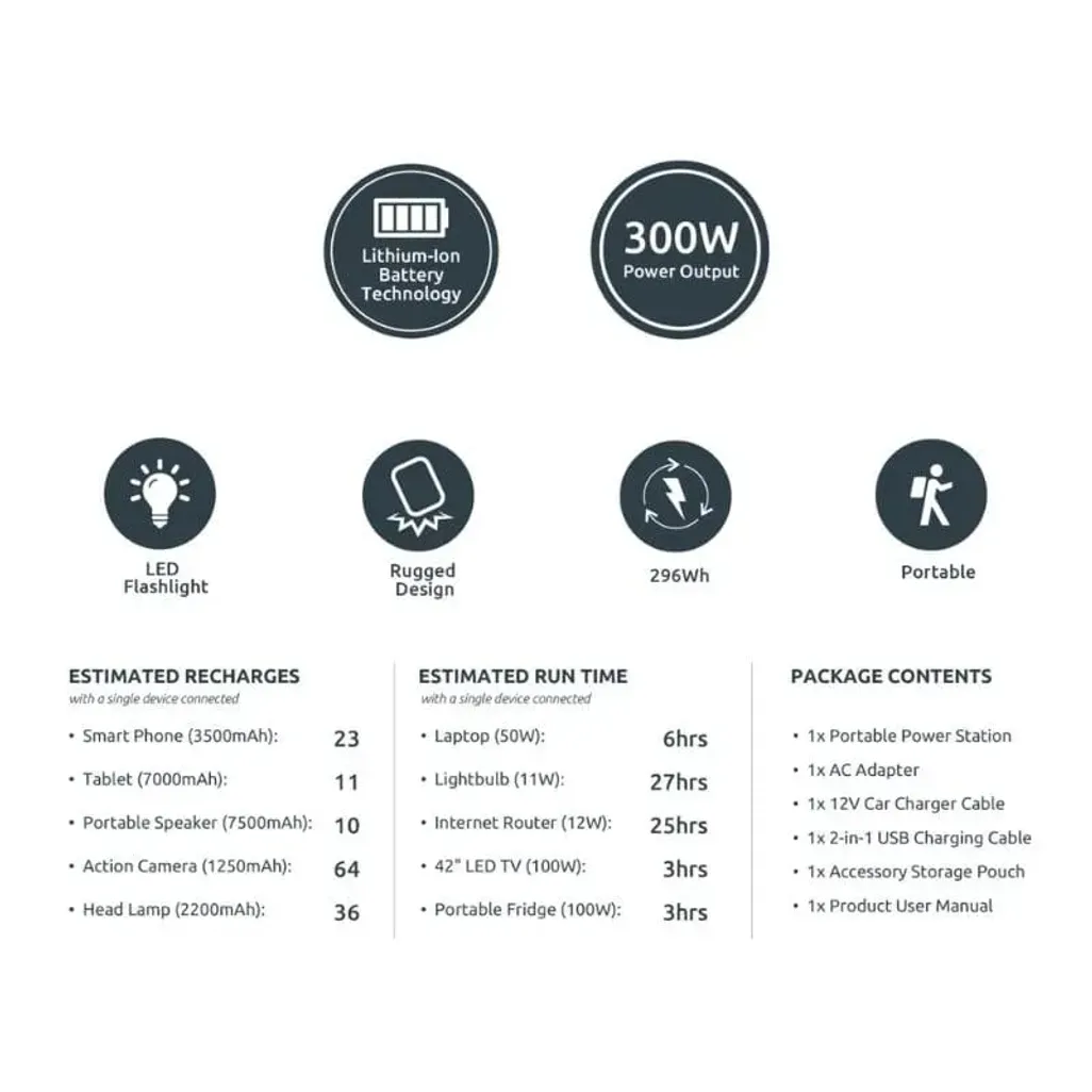 Please note: Ensure the total power consumption for all connected appliances is less than 300W prior to connecting the device to the AC port. If the power requirement that is drawn exceeds 300W, the device will shut down and this may cause damage. The device is recommended to be used as a Power Station; not as an always-on, pass-through solution. It is not recommended to use the device while charging or to leave it constantly plugged into the mains, as this can cause battery degradation.