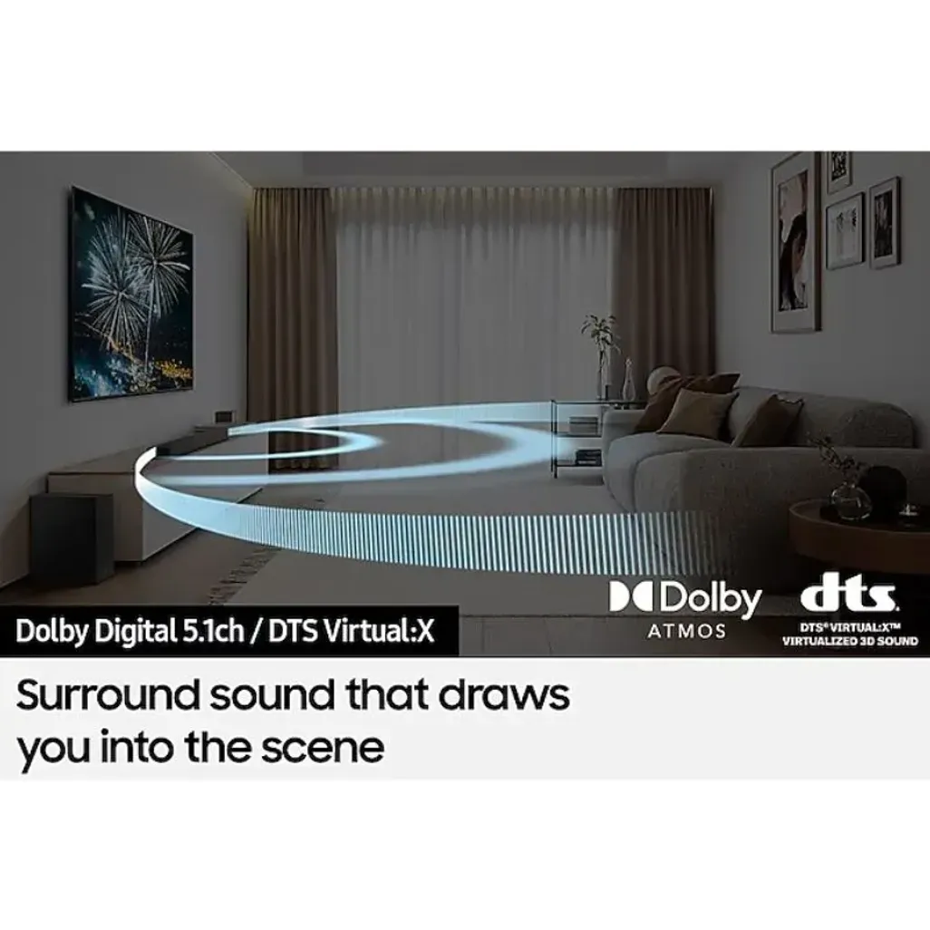The Samsung 5.1 Channel B-Series Soundbar includes a wireless subwoofer, to expand your soundbar to a surround sound system easily, without the mess of wires. Dolby Digital 5.1 and DTS Virtual:X technology will create a multi-dimensional audio environment. You can enjoy incredible 3D surround sound in the comfort of your home.