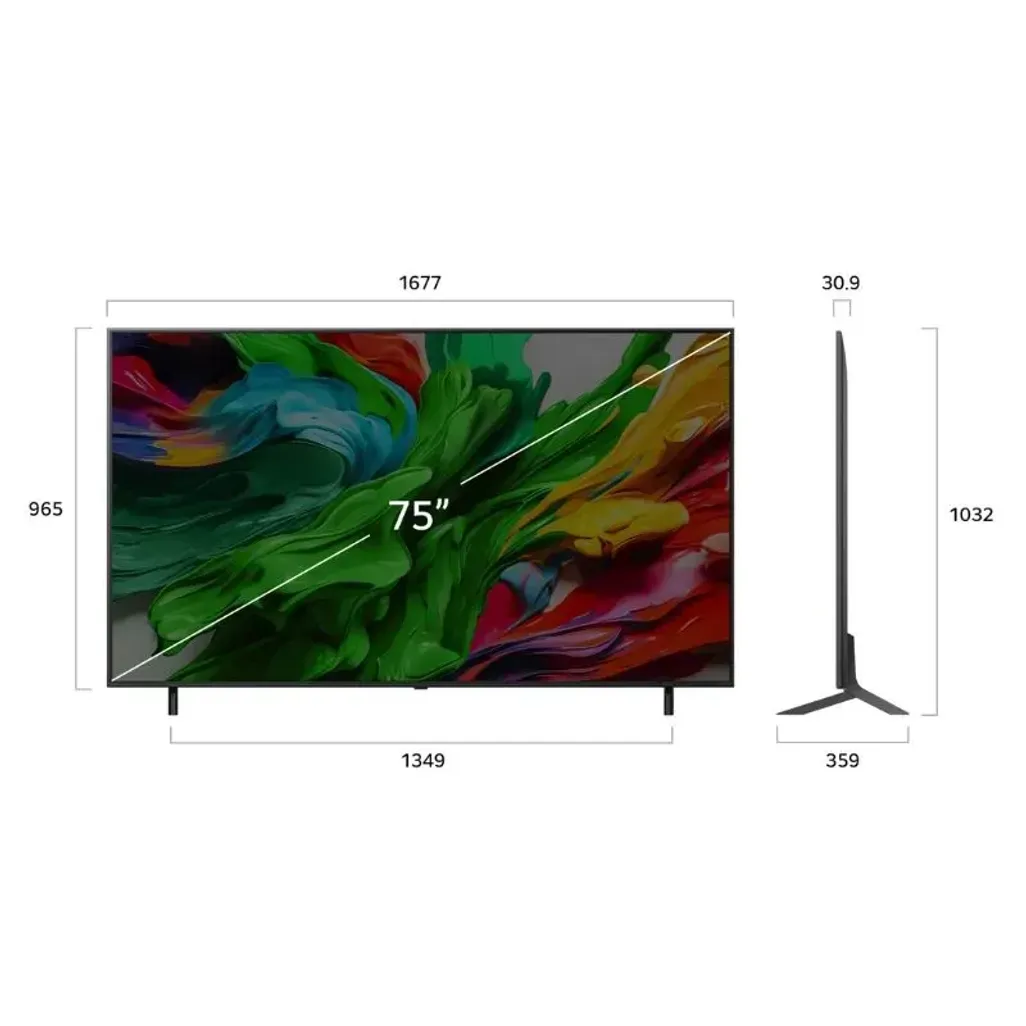 The dimensions for the LG 75 Inch QNED UHD 4K Smart TV are H 965mm x W 1677mm x D 359mm and it weighs 29.4kg. The LG TV comes with a 2 year guarantee.