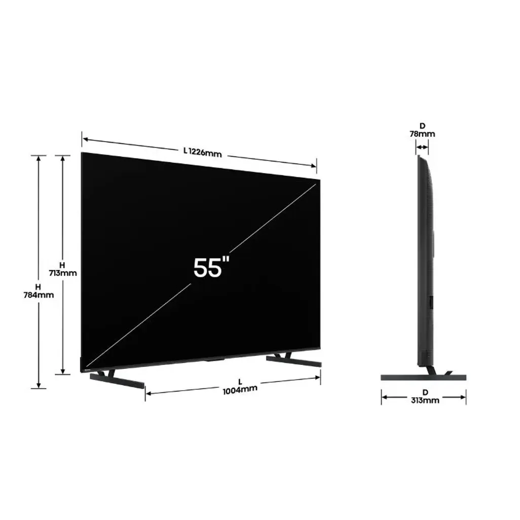 The dimensions for this Hisense 55 Inch ULED Mini LED 4K Smart TV are H 713mm x W 1226mm x D 78mm, and it comes with a 4-year guarantee.