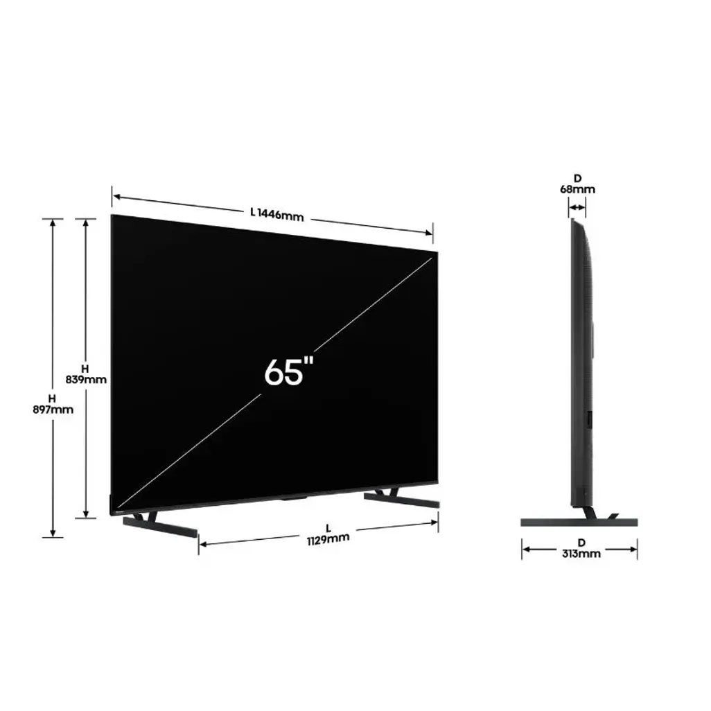 The dimensions for this Hisense 65 Inch ULED Mini LED 4K Smart TV are H 839mm x W 1446mm x D 68mm, and it comes with a 4-year guarantee.