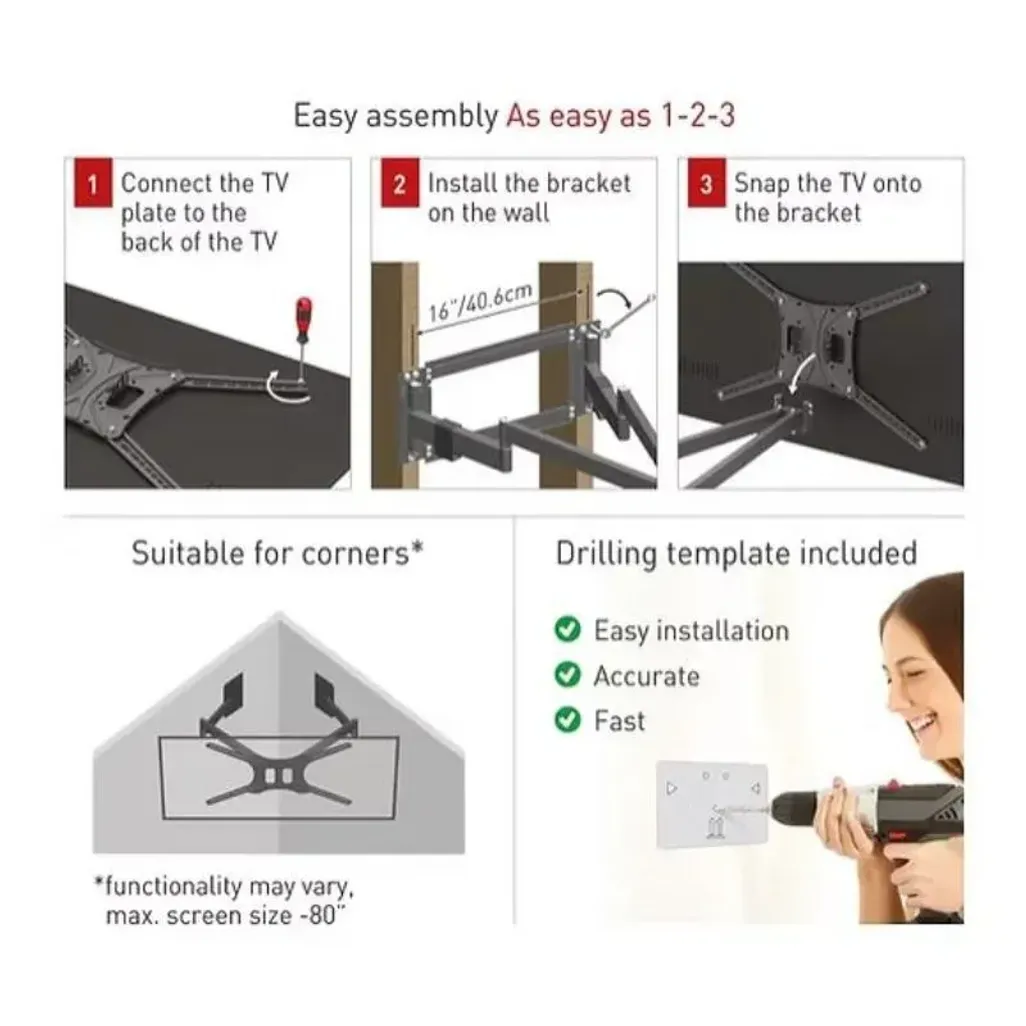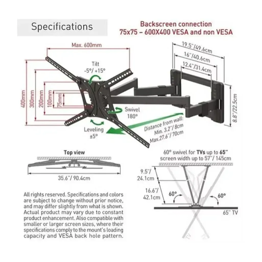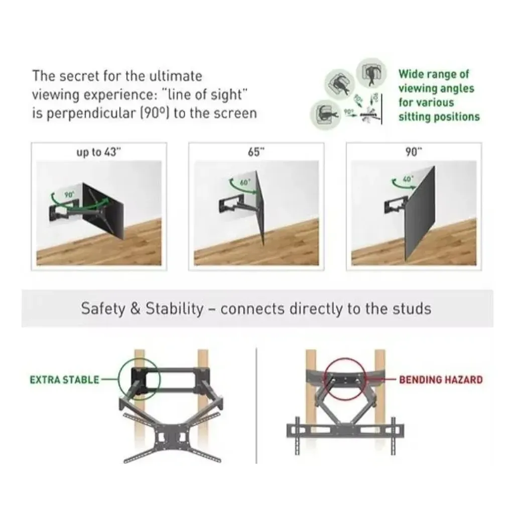 The minimum distance from the wall is 8cm, and the maximum distance from the wall is 70cm. Depending on the installation limitations, corner installation for screens up to 203cm can be done. The bracket is suitable for wood-stud walls, where the studs are 16 inches apart.