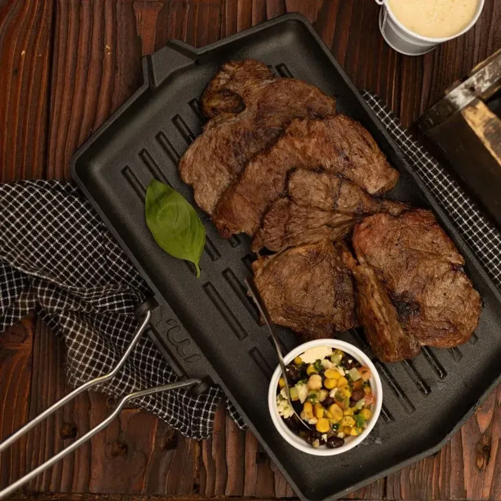 Create flavorful meat, with char marks that mimic the look of food grilled on a braai, using the Megamaster 360 Rectangular Chargriller, which has a ribbed surface for perfect sear marks. It is made from cast iron, for durability, and it is vegetable coated, so you can sear anything on this chargriller, from steak to vegetables.