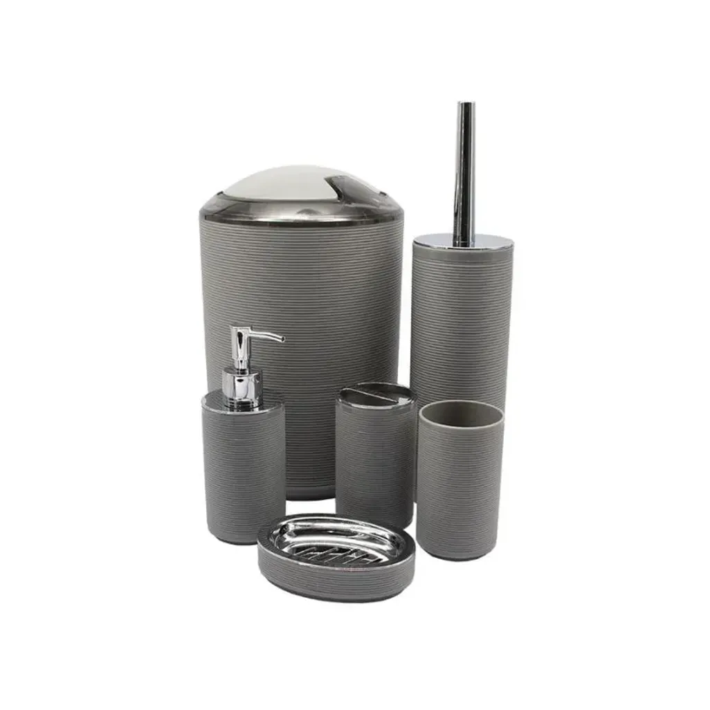The Regent 6 Piece Bathroom Set includes a toothbrush holder, tumbler cup, soap dish, liquid soap dispenser, toilet brush with holder, and a sleek trash can.