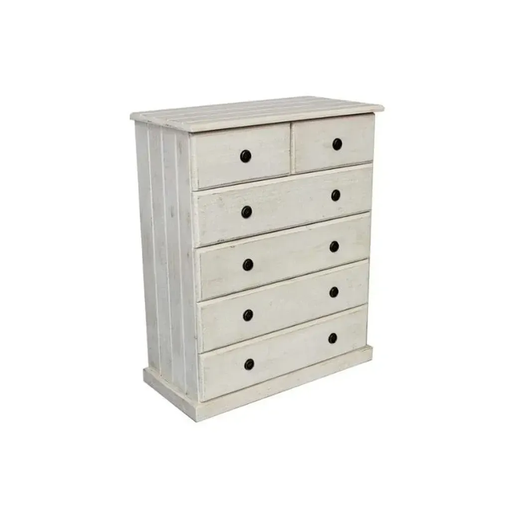 The Beach House Chest of Drawers is made of pine wood and has a white wash finish. With 6 drawers, there will be additional storage space, for your clothes and accessories as well.
