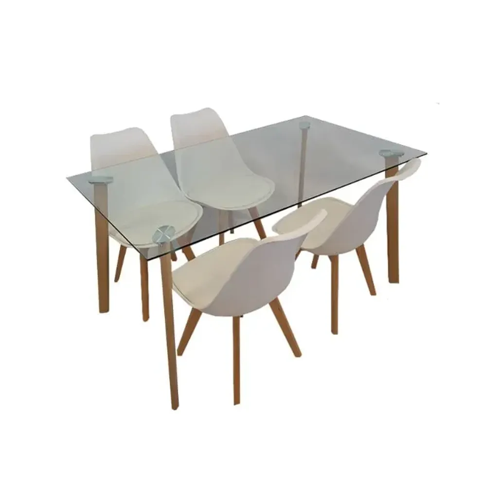 Experience the perfect blend of style and utility with the Acnes 5 Piece Dining Room Suite. This dining set embodies modern aesthetic design with a focus on durability, making it ideal for cozy family dinners as well as sophisticated entertaining. The table features a high-quality tempered glass top that provides a sleek appearance and superior durability. The legs of the table mimic a wooden finish but are crafted from robust metal, enhancing stability and longevity. Each chair in this suite boasts a durable polypropylene seat that is easy to maintain, coupled with a soft cushion for added comfort during lengthy dining sessions.