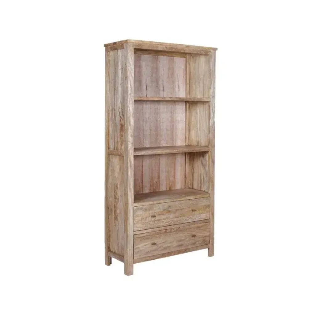 Elevate your living space with the Palma Bookcase, expertly crafted from sustainable Mango Wood. The three open shelves offer ample space to showcase your favorite books, treasured souvenirs, or decorative items, while the two spacious drawers at the base provide practical storage solutions for keeping your space clutter-free, ideal for stowing away personal items, office supplies, or media accessories.