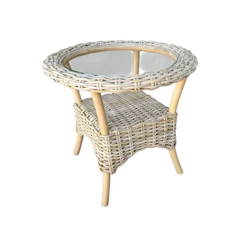 The table features a round top, making it perfect for holding drinks, books, or decorative items like candles or plants. It is lightweight yet durable in its construction. Easy to move around, making it ideal for use as a bedside table, living room accent piece, or even a stylish addition to your patio or sunroom. The Delhi Kubu Rattan Side Table offers both practicality and elegance, creating a cosy, inviting atmosphere in your home while adding a touch of nature-inspired beauty and comes included with a glass top.