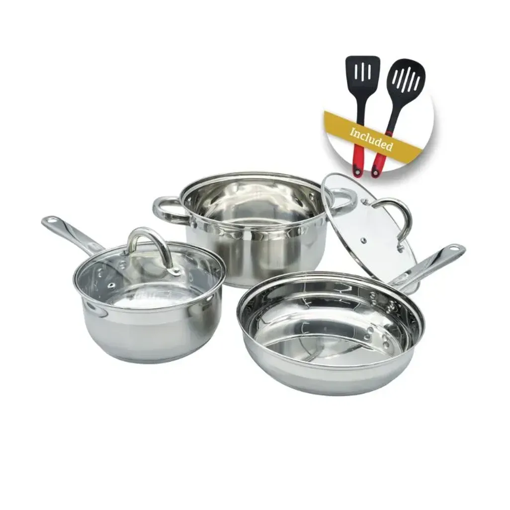 Boil, bake, and fry delicious meals, using the Snappy Chef 7PCE Supreme Combo, which consists of an 18cm saucepan, 22cm frying pan, and 22cm casserole pot, and there is a spatula and skimmer included.