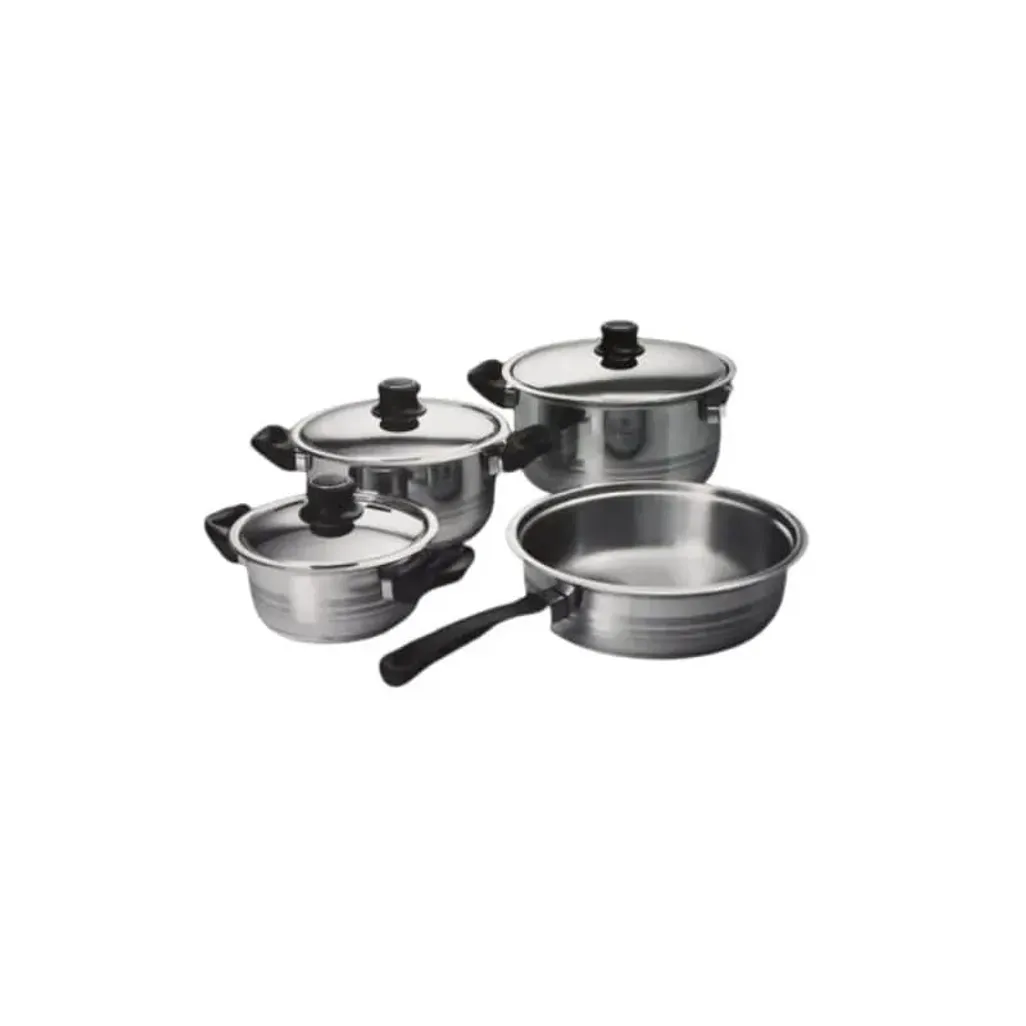 The Aloe 7-Piece Cookware Set is perfect for those who love to cook up a storm in the kitchen. This set consists of a 16.5cm, 21cm and 25cm casserole with lids and a 25cm frying pan with no accompanying lid, the set is made with Quality 304-18/8 Stainless Steel. With a 5mm encapsulated base, bakelite handles with stainless steel flame guards, you will have a superior cooking experience.