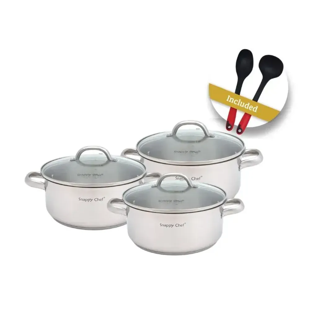 Prepare your family's favorite meals and treats using the Snappy Chef 6PCE Budget Cookware Set, which compliments any household kitchen. They have a high-quality stainless steel body, and satin polished riveted handles.