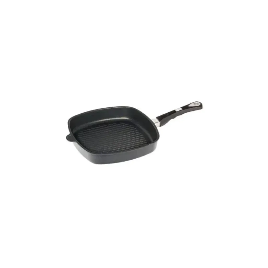 The AMT 28cm Grill Surface Square Pan is one of the most practical and versatile pans in your cookware arsenal as it can be used to grill juicy steaks, burgers, chicken or seafood and even your vegetables can be cooked in the pan. Grill pans differ from other frying pans due to raised grill lines of about 0.5cm high and 2cm apart, allowing juices from the food to drip down. Like other AMT pots and pans, the AMT 28cm Grill Surface Square Pan is made of a heavy-duty hand-cast aluminium pan and has a non-stick coating that is heat resistant up to 240 °C. The handle is heat resistant up to 150 °C. For the best cooking experience and even heat distribution, the non-stick coating is PFOA free.
