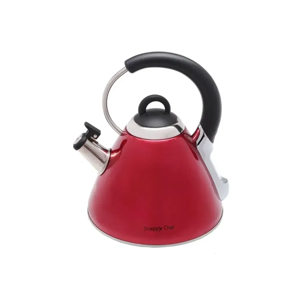 The Snappy Chef 2.2L Red Whistling Kettle has a red powder-coated exterior and a 2.2L capacity. Comes with a black rubber handle lid, that has a stainless steel finish.