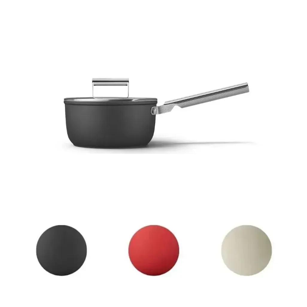 The Smeg 20cm Saucepan has a 2.7L capacity and comes with a tempered glass lid. It is made of cold-forged aluminum and has a non-stick coating. Available in black, cream, and red.