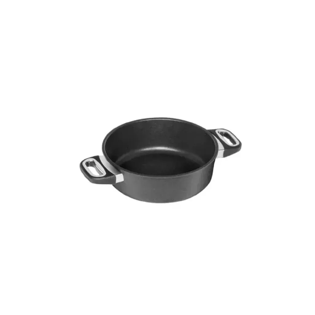 The AMT 26cm Braising pan is one of the most practical and versatile pans in your cookware arsenal as it can be used to cook soups, pasta and sauces. Other uses include frying doughnuts, fried chicken, fish fillets and fries and many other dishes. The AMT 26cm Braising pan is made of a heavy-duty hand-cast aluminium pan and has a non-stick coating that is heat resistant up to 240 °C. The handles are heat resistant up to 150 °C. For the best cooking experience and even heat distribution, the non-stick coating is PFOA free. In addition, the pan has a special thermal base that aids in distributing heat both on the bottom and walls of the pan, in other words, your meals will cook quicker and evenly.