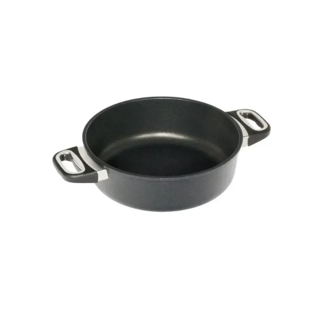 The AMT 32cm Braising pan is one of the most practical and versatile pans in your cookware arsenal as it can be used to cook soups, pasta and sauces. Other uses include frying doughnuts, fried chicken, fish fillets, fries, and many other dishes. The AMT 32cm Braising pan is made of a heavy-duty hand-cast aluminium pan and has a non-stick coating that is heat resistant up to 240 °C. The handles are heat resistant up to 150 °C. For the best cooking experience and even heat distribution, the non-stick coating is PFOA free. In addition, the pan has a special thermal base that aids in distributing heat both on the bottom and walls of the pan, in other words, your meals will cook quicker and evenly.