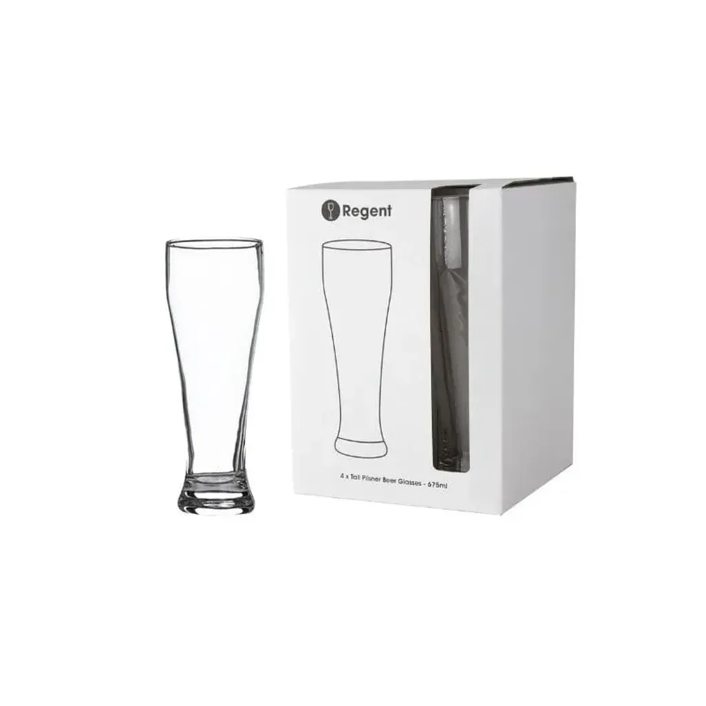 Elevate your beverage service with the Regent Tall Pilsner Glass Set, an essential choice for restaurants, bars, and catering events. With a generous 675ml capacity, these glasses are perfect for serving a variety of refreshing drinks, from crisp pilsners to other chilled beverages. Their sleek, tall design not only enhances the presentation of your drinks but also fits comfortably in hand. Crafted for durability and convenience, these glasses are dishwasher safe, ensuring easy cleanup and consistent use. Whether you're hosting a large event or managing a busy venue, the Regent Tall Pilsner Glass Set comes in a set of 4 and combines practicality with style, making it a top choice for any professional setting.
