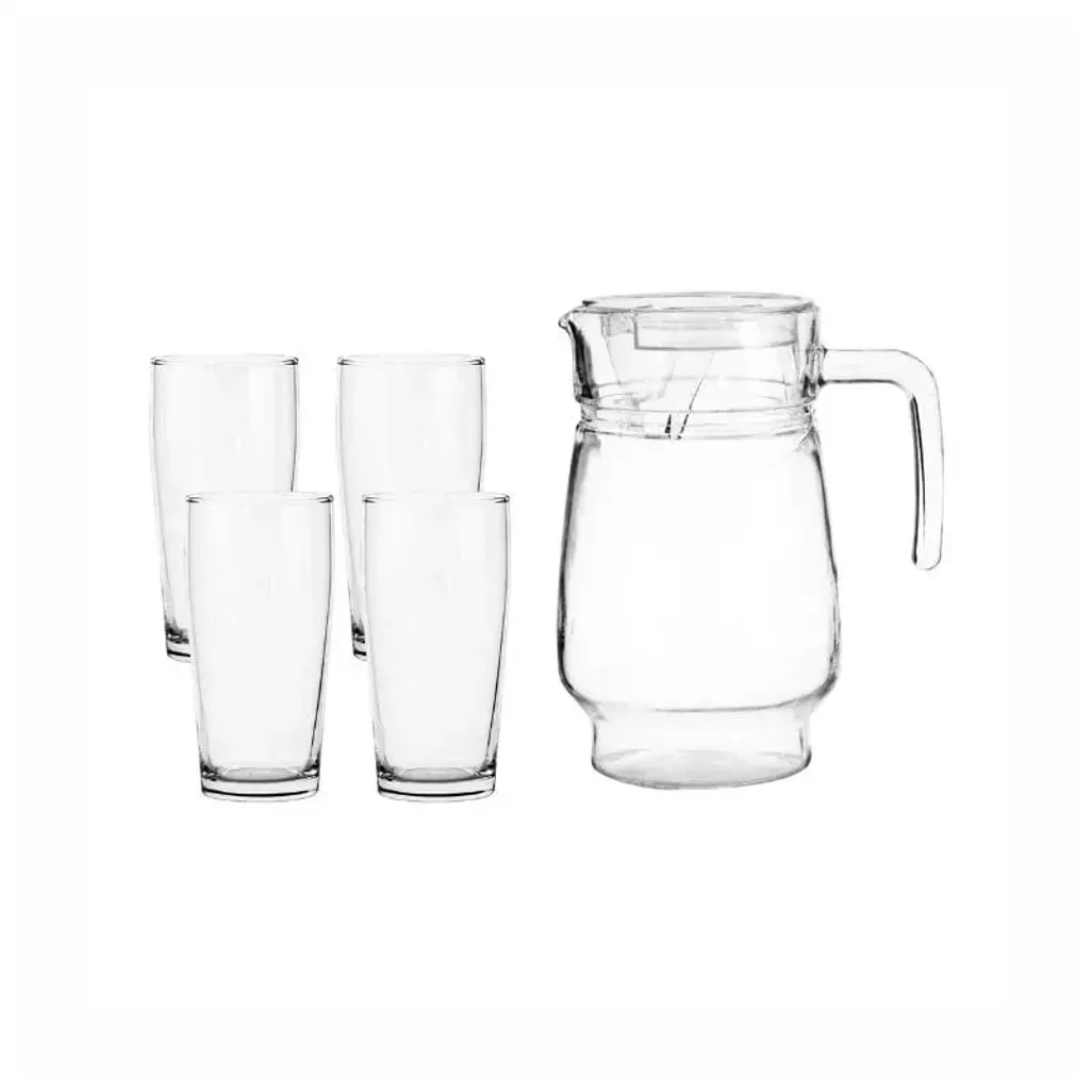 The Regent Water Jug With Tumbler Set consists of a clear 1L glass jug and four 340ml willy tumblers. This jug and tumbler set can be used to serve juice, water, or other beverages for your guests. Ideal for restaurants, bars, and special occasions.