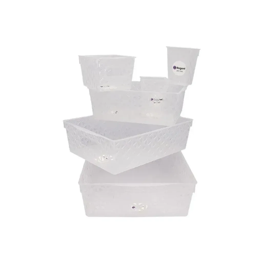 Each basket features thoughtfully designed holes, ensuring excellent ventilation to keep your stored items fresh and easy to locate. Made from high-quality, BPA-free plastic, this set promises both safety and durability. Whether you're seeking to streamline your desk, declutter your pantry, or create a sense of zen in your bathroom, the Regent 6-Piece Plastic Venice Basket Set is the ideal solution.