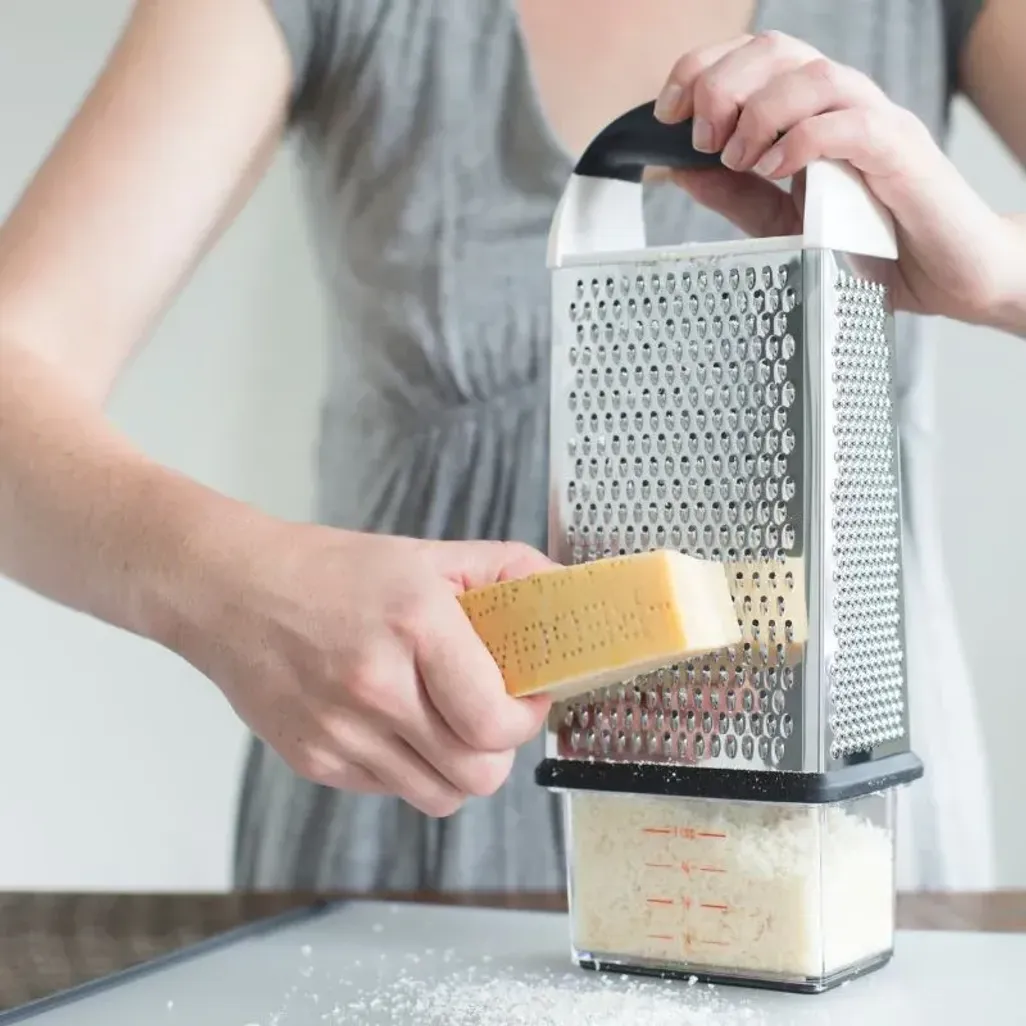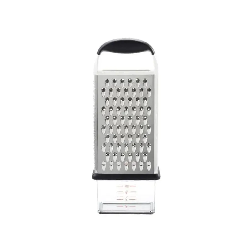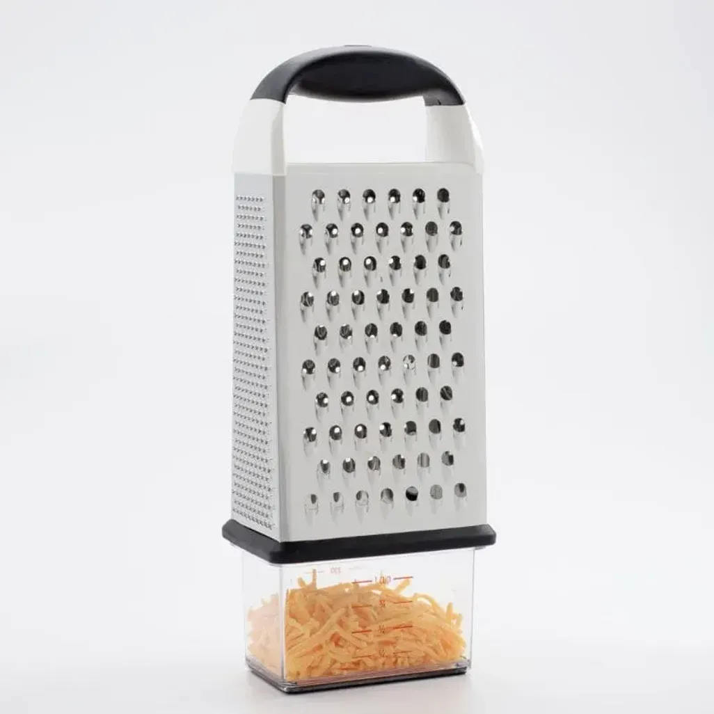 The OXO Good Grips Box Grater has four stainless steel surfaces, two for coarse and medium grating, and the other two surfaces can be used for fine grating and slicing. You can store your freshly grated ingredients in a convenient container.