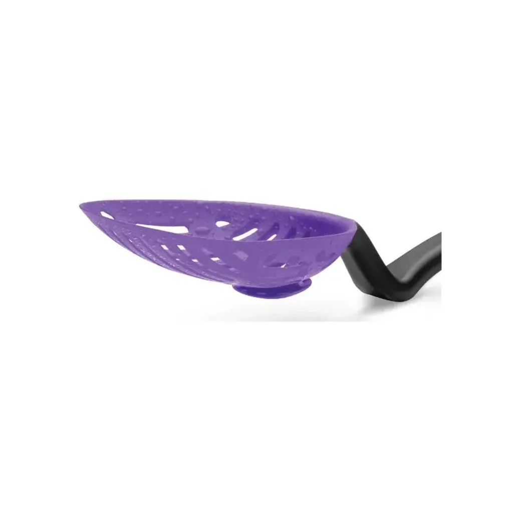 The Dreamfarm Lestrain Purple Dripless Sit Up Strainer is a scoop strainer designed to contain its own drips and comes with a flexible head. It features a curved handle designed to elevate the head above the counter, preventing any mess.