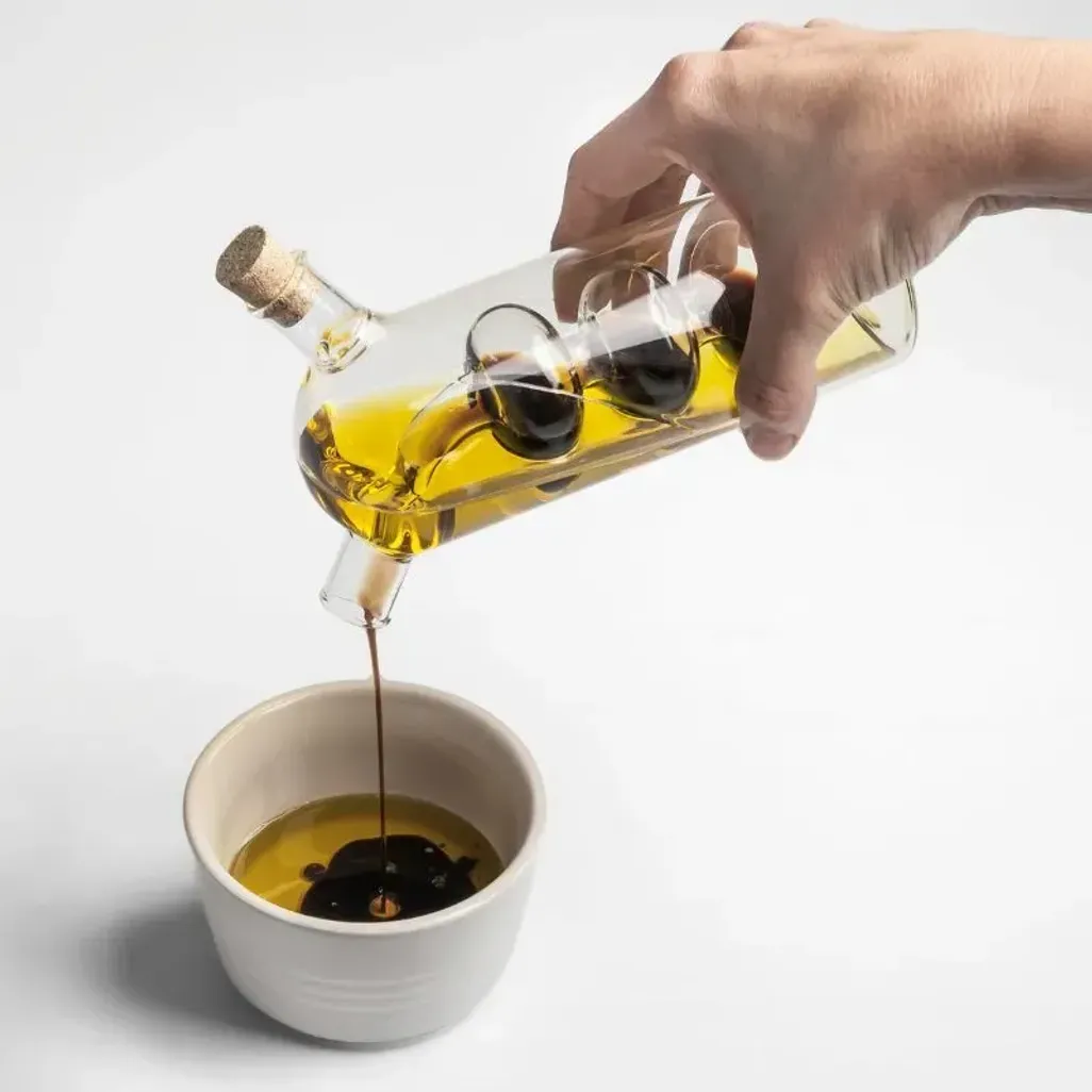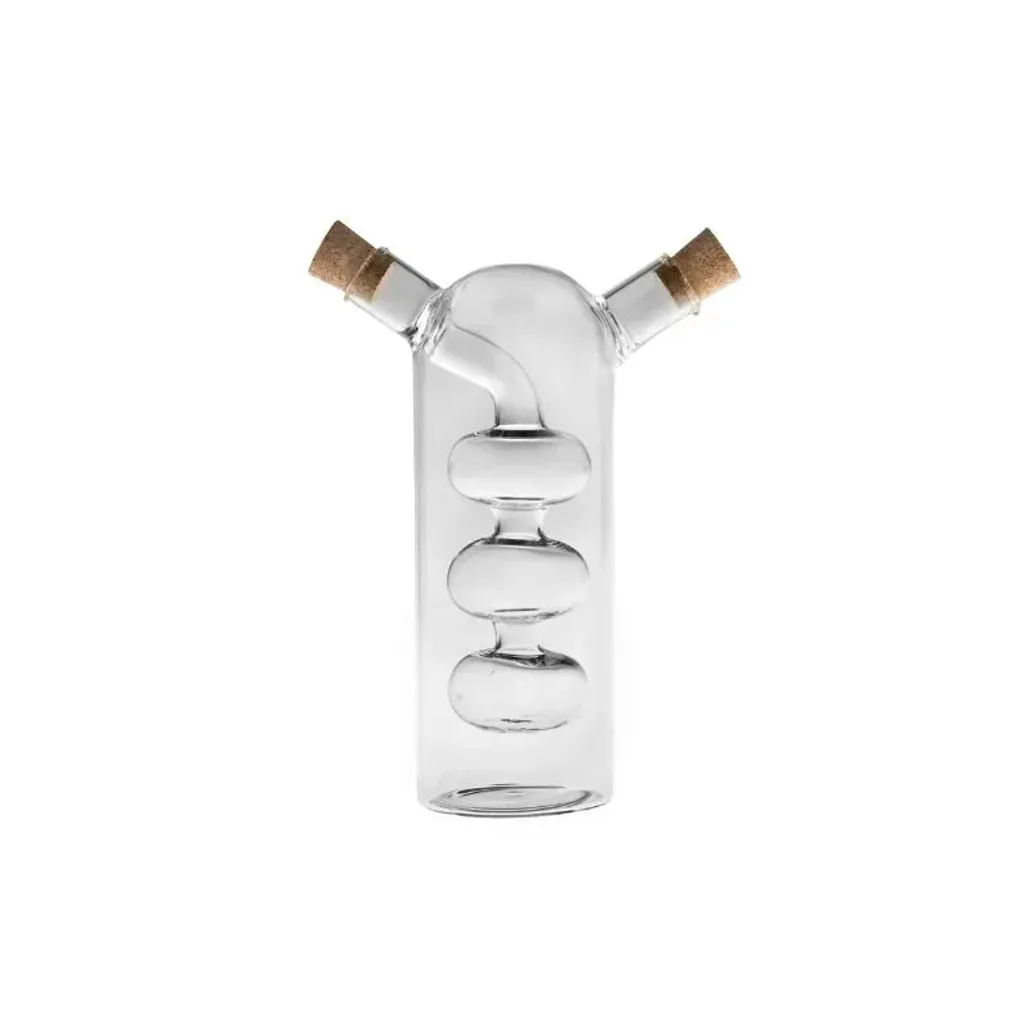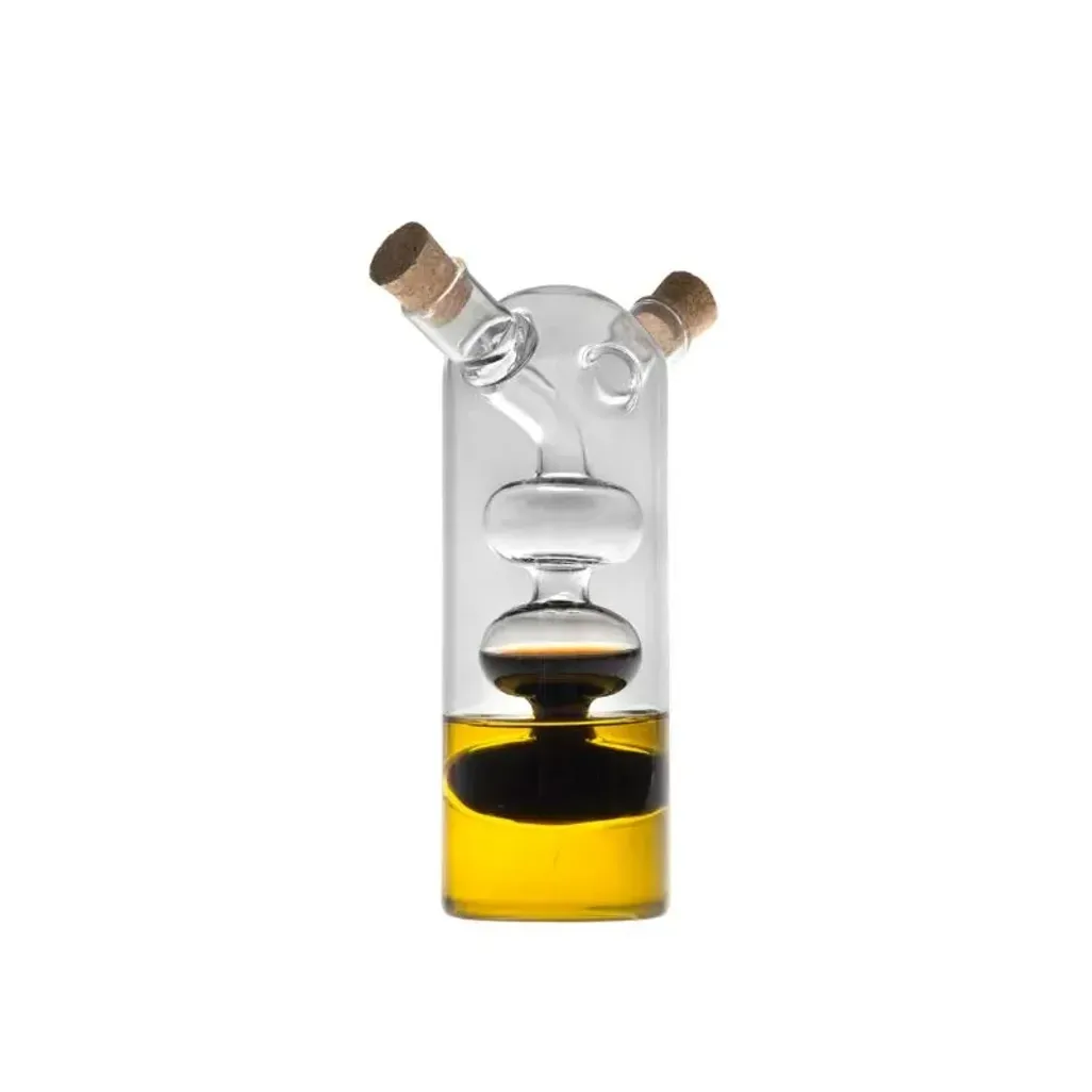 The Humble & Mash Oil & Vinegar Pourer consists of two bottles, that are incorporated into one, so you are able to fill one side with oil, and the other with vinegar. Perfect for dressing salads at the table.