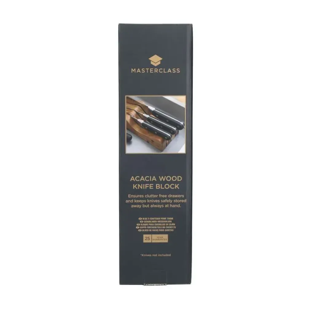 You can keep your kitchen knives safely stored in your drawer, using the MasterClass In-Drawer Knife Storage Block. It is made of natural acacia wood, which will protect the blades of your knives, and it can hold almost any type of kitchen knife. In addition, it can accommodate blades with serrated or straight edges.