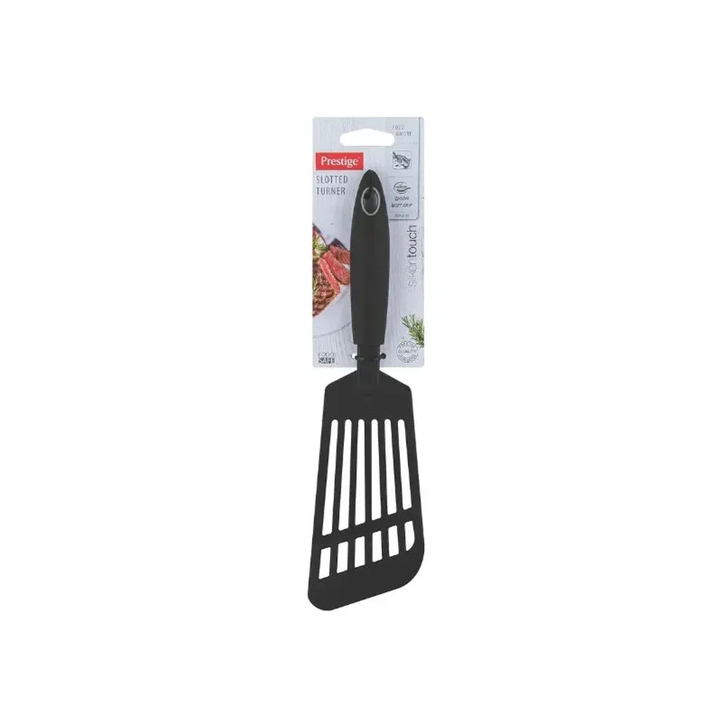 Serve and turn your food, using the Prestige Nylon Long Slotted Turner. This nylon long slotted turner is ideal for making burgers, pancakes, eggs, and you can remove biscuits from a baking tray.