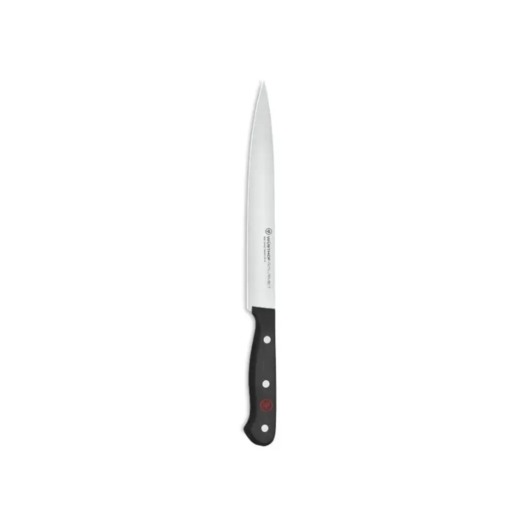The Wüsthof 20cm Gourmet Carving Knife is longer with a narrower blade than a chef's knife, which means you are able to cleanly cut through meat. The pointed tip is designed to help you remove meat away from the bone. This knife is ideal for carving and cutting foods like fruit, meat and vegetables.