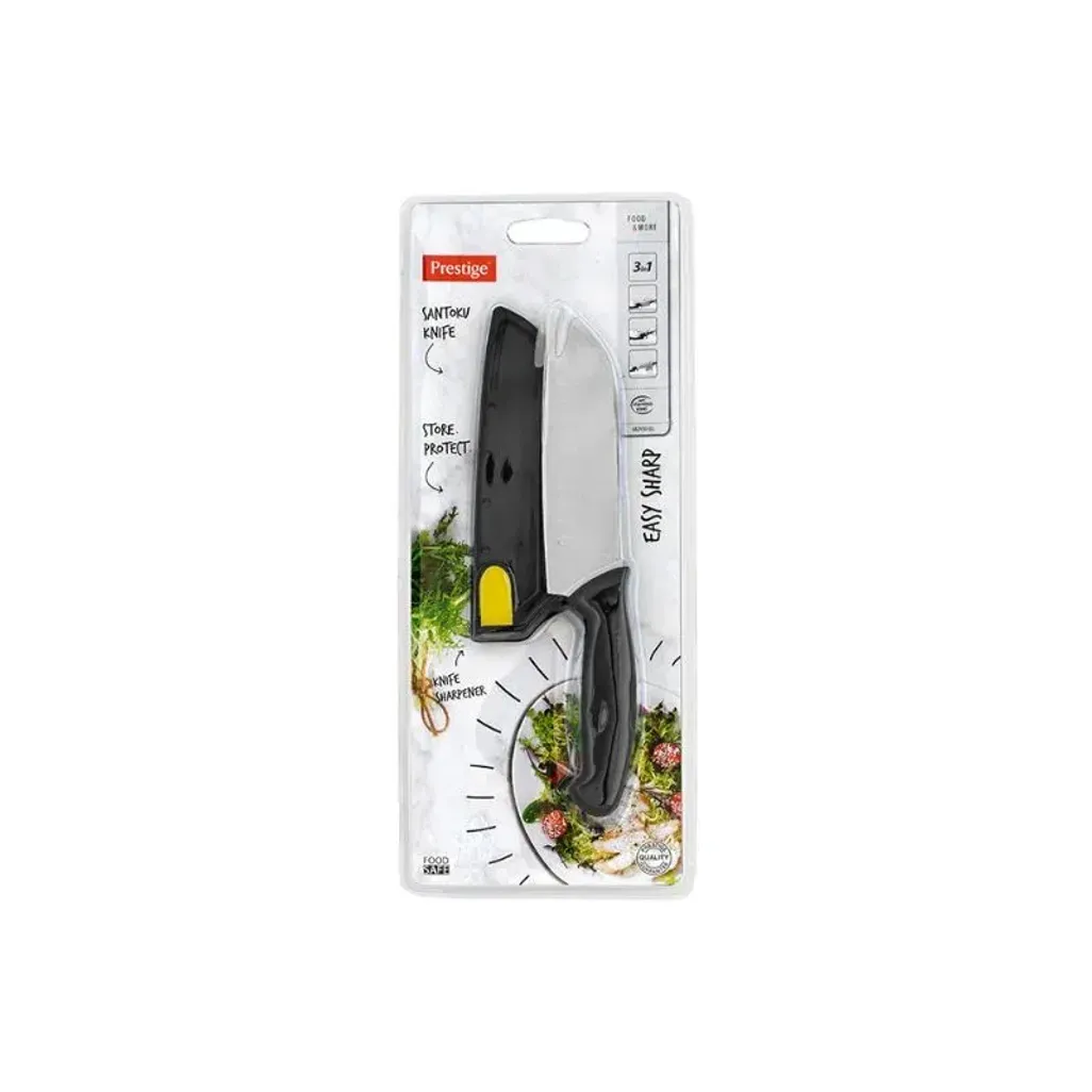 The Prestige 13cm Santoku Knife is a multi-purpose knife with a stainless steel blade, which is ideal for chopping, cutting, and mincing fruits, vegetables and herbs, and meat. There is a knife sharpener, that can be used to store your knife as well.