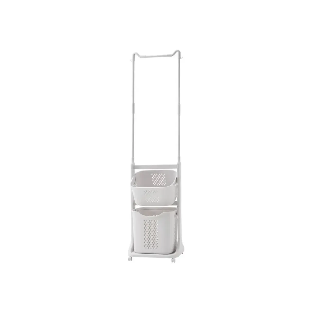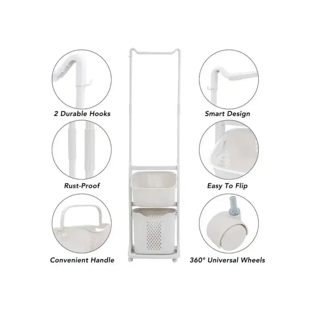 The rack features tall hanging space for your clothes, ensuring ample room to dry large loads. Underneath, two different-sized laundry baskets offer the perfect place to sort or store your laundry, helping to streamline your process from washing to folding.