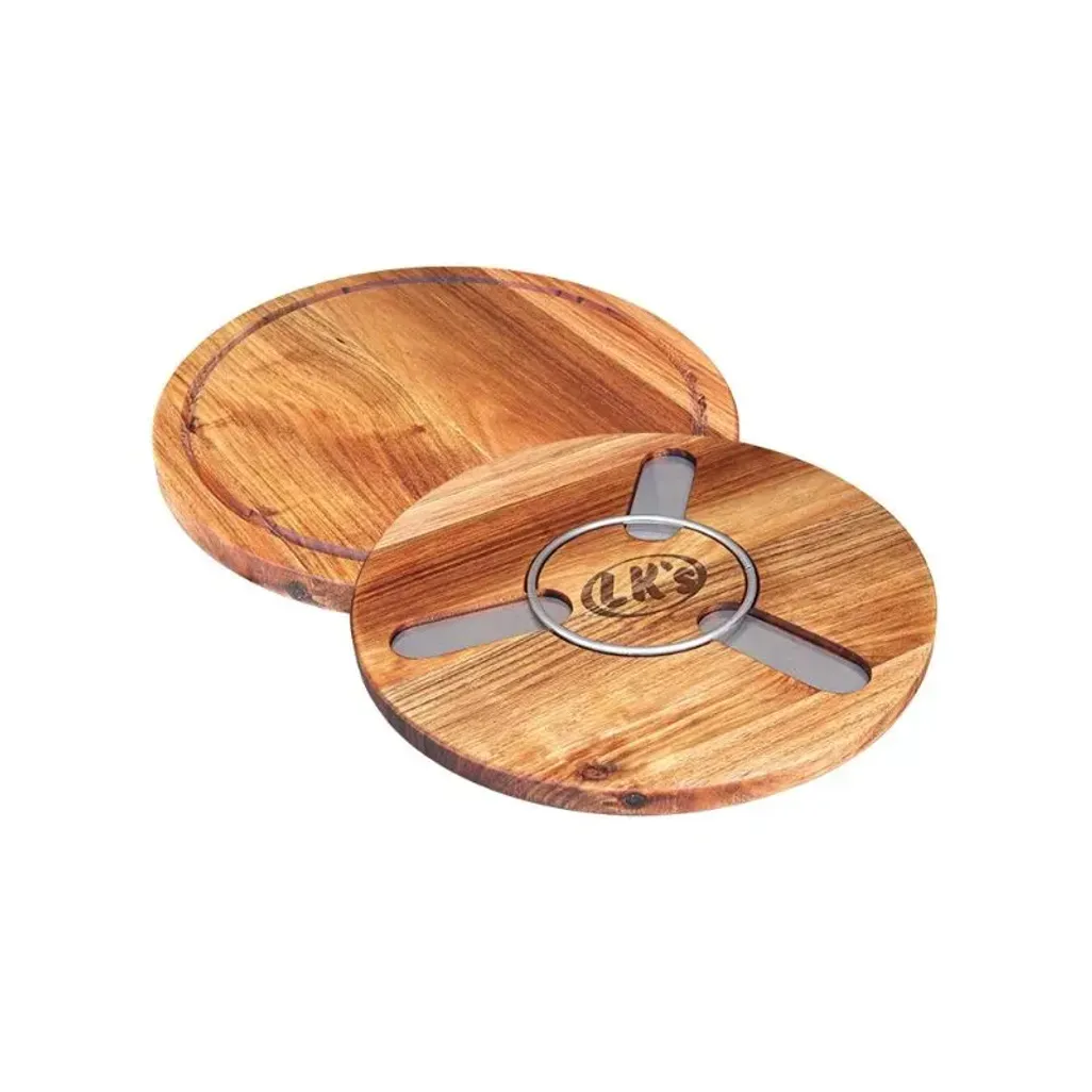The LK's Potjie Board is a reversible cutting board, with metal grooves for 3-legged pots and there is a a stainless steel metal ring to accommodate a casserole pot.