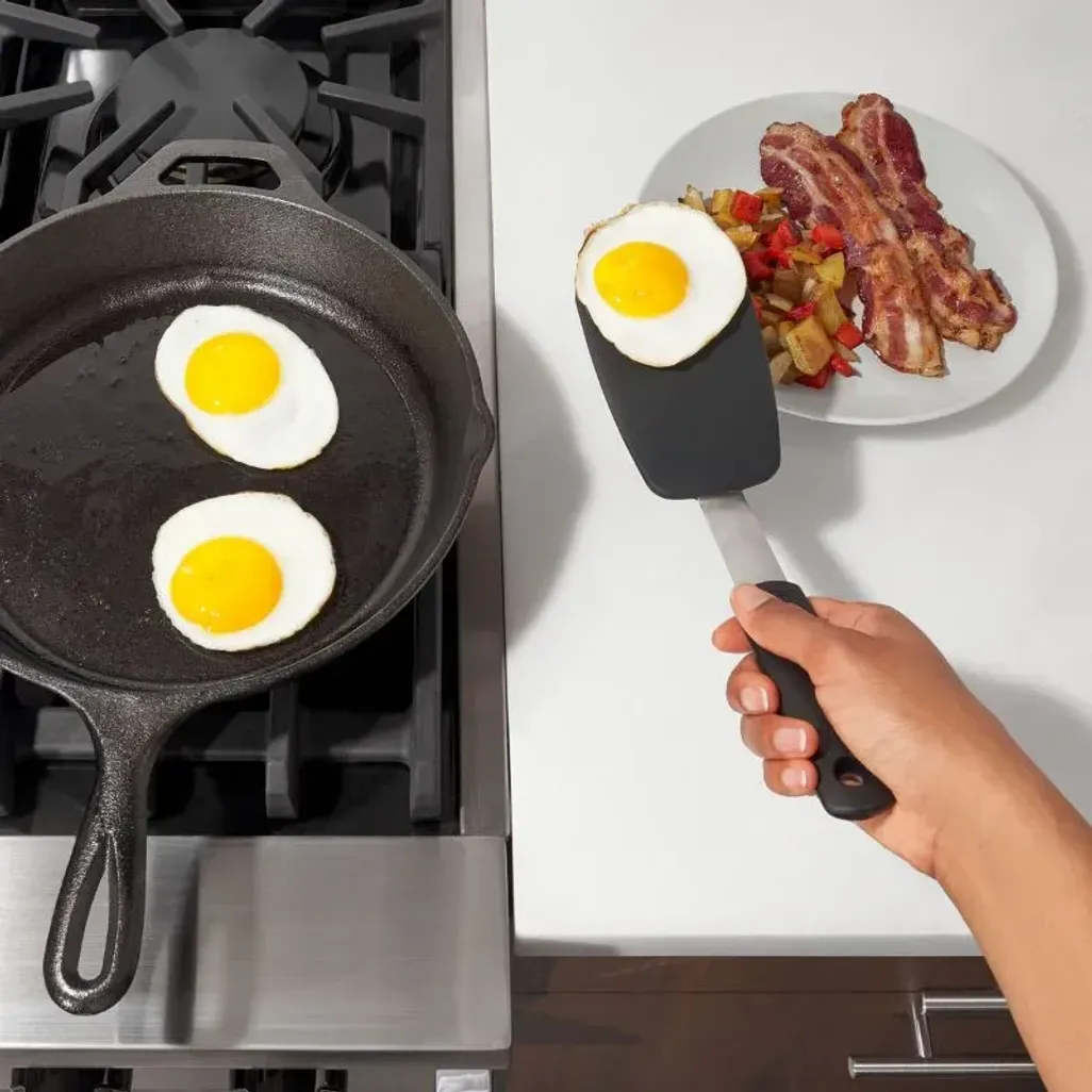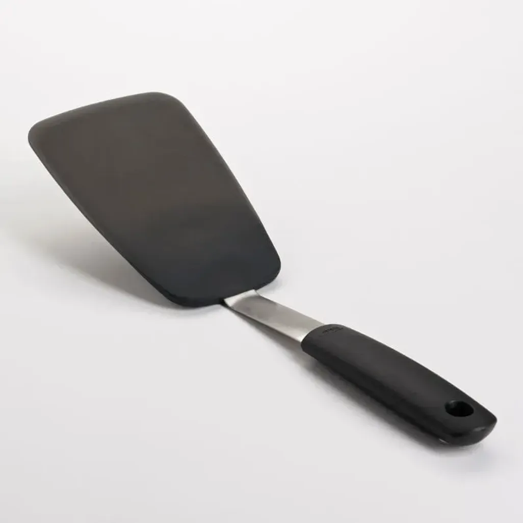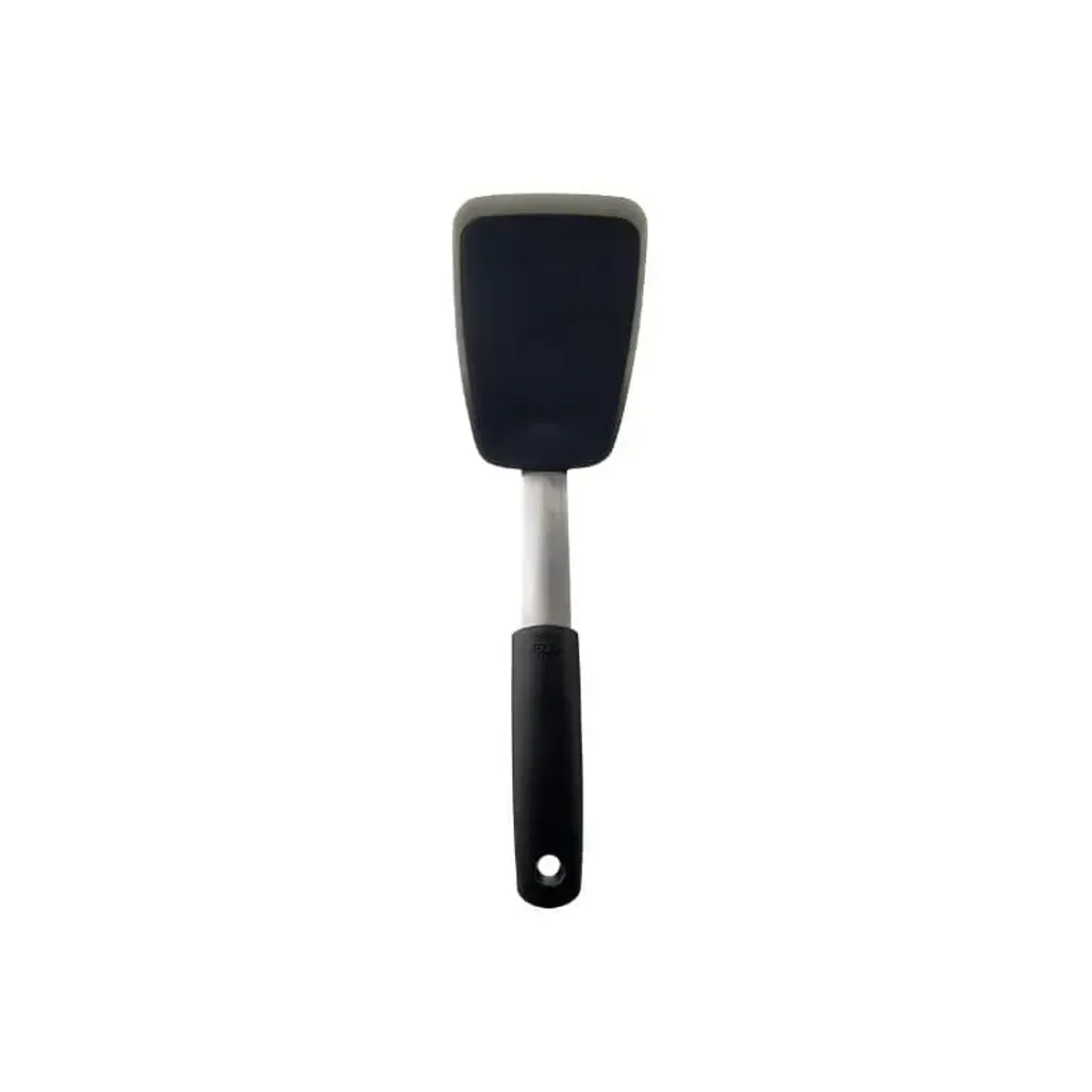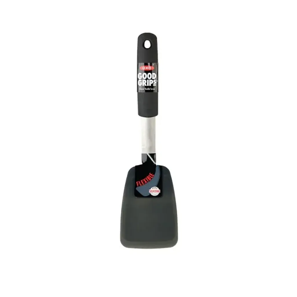 The OXO Good Grips Small Silicone Flexible Turner combines the strength of stainless steel with heat resistance and the non-stick friendliness of a silicone outer layer. With thin and flexible edges, you can easily glide it under your food.