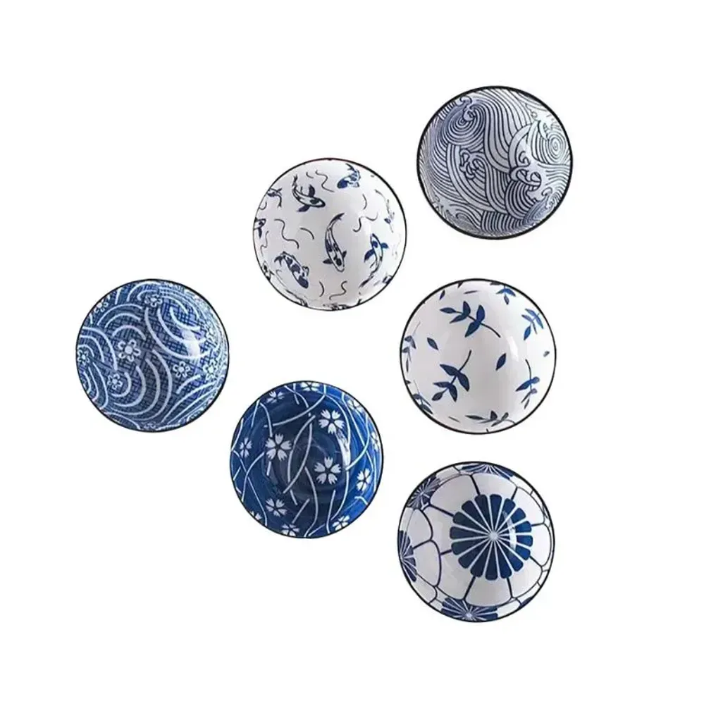 The Home4U 6 Piece Asian Dipping Bowl Set consists of six ceramic arctic bowls, with a unique white and blue colour design that features flowers and geometric patterns, to brighten up your dining table. Both the colour and pattern of the bowls will not fade and it is free of cadmium and lead, so they are safe and durable.
