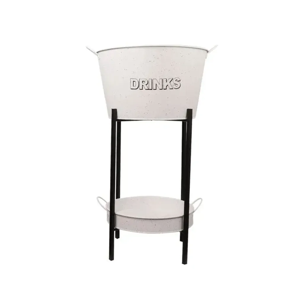 The Bar Butler Wine Bucket with Handles and Mottled Stand combines rustic charm with functional design, making it an ideal accessory for outdoor gatherings. Crafted from galvanized steel, the bucket features a stylish white and mottled black powder coating with a "DRINKS" print, giving it a timeless, rustic appeal. Its durable coating ensures no peeling or flaking, providing long-lasting quality.
