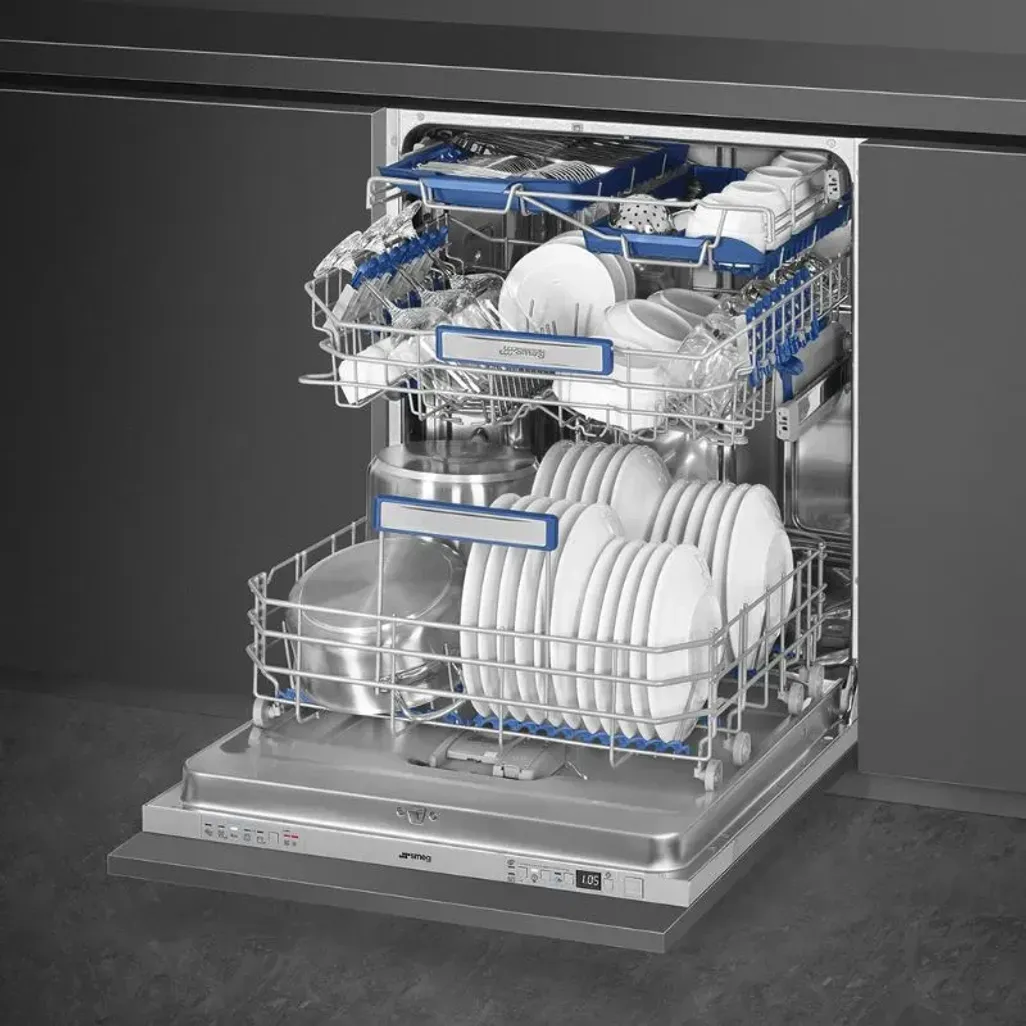 The Smeg 14 Place Built-In Dishwasher is made to provide an optimal cleaning performance while also being an energy-efficient dishwasher. This dishwasher is designed so that you can adjust and alter the upper basket which has 3 horizontal height adjustment levels (5cm), this allows you to create more space when needed. With a FlexiDuo 3rd cutlery basket, you have the freedom to arrange your cutlery, small cups, and bulky utensils as you'd like to.