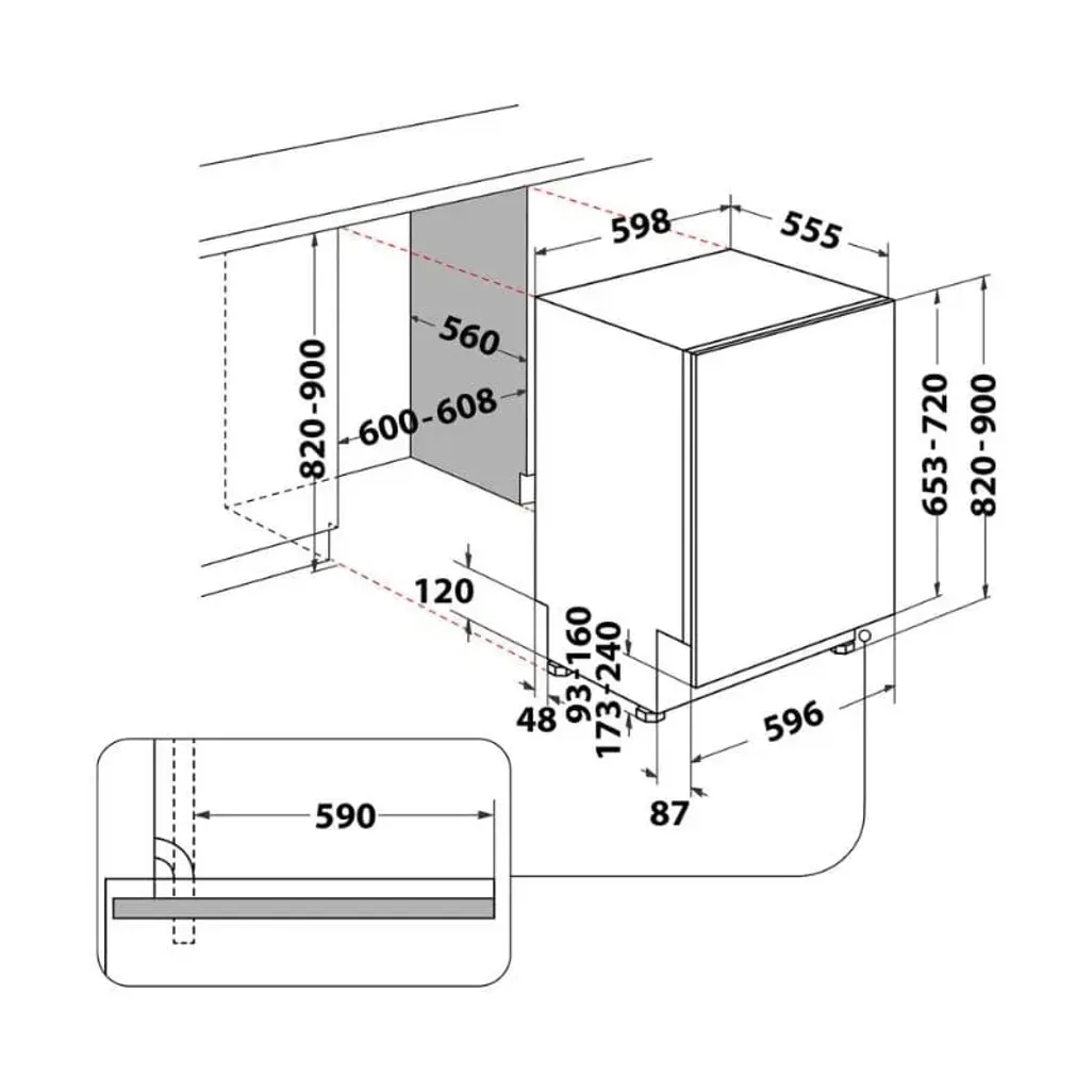 The dimensions of this Whirlpool Dishwasher are H 820mm x W 598mm x D 555mm, and it has a 2-year guarantee.