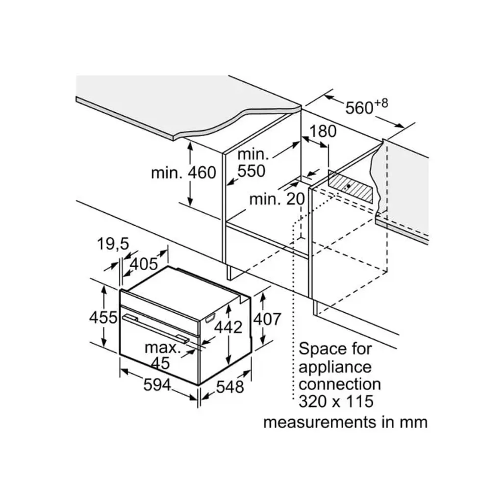 The dimensions of the Bosch 45L Compact Microwave Oven are 455mm x 594mm x 548mm, and this Bosch Microwave Oven has a 5-year guarantee.