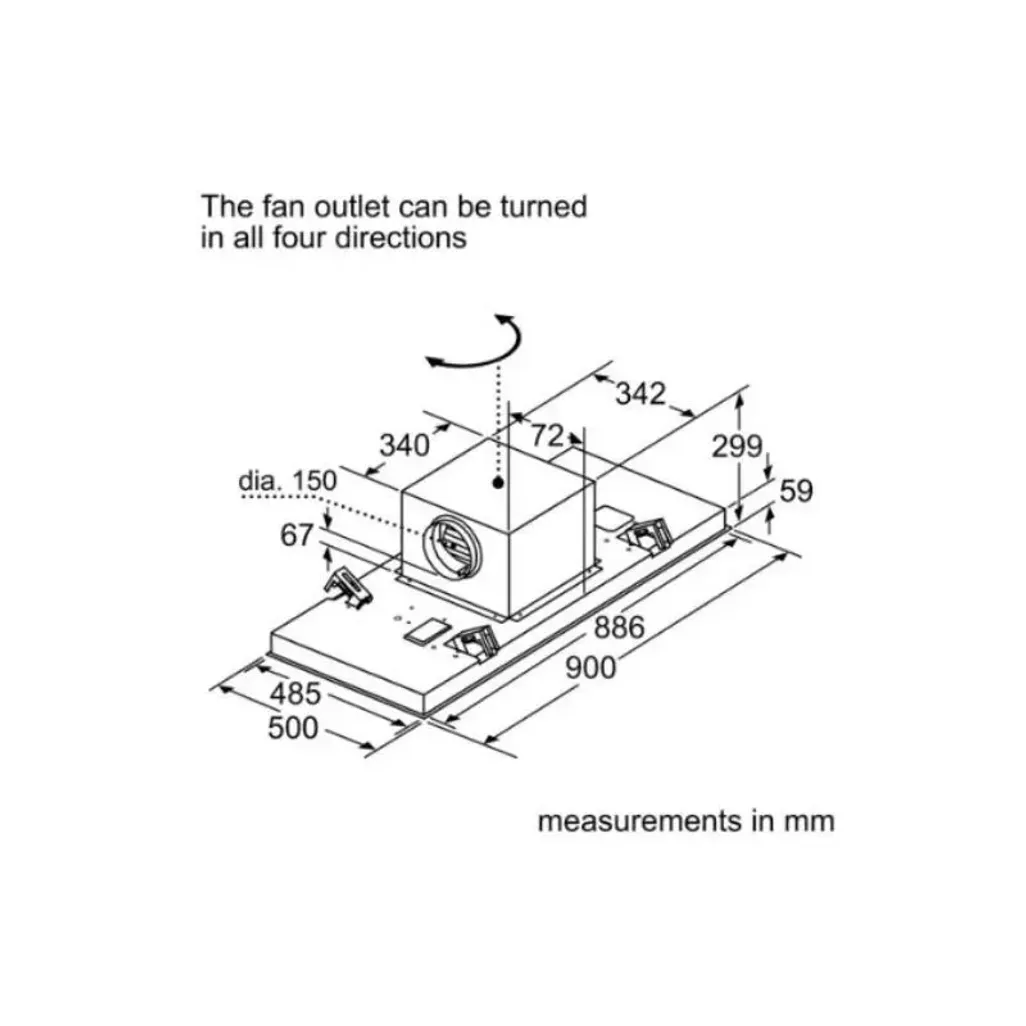 The dimensions for this Siemens 90cm Integrated Ceiling Extractor are H 300mm x W 900mm x D 500mm with a weight of 19.7kg. The required niche size for the installation is H 299mm x W 888mm x D 487mm.