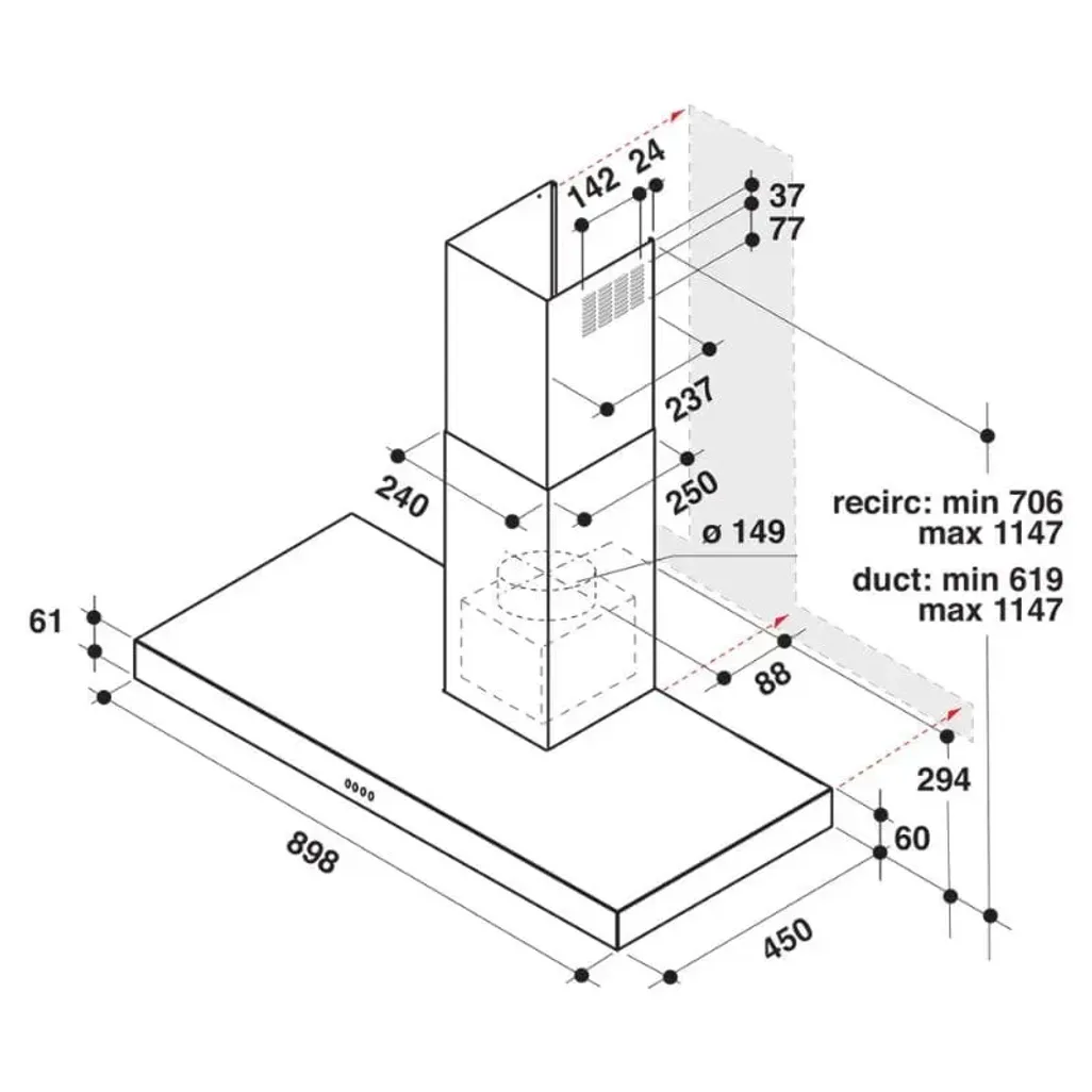 The dimensions of this Whirlpool T-Shaped Cooker Hood are H 1150mm x W 898mm x D 450mm.