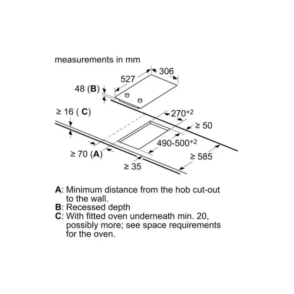 The dimensions for the Bosch 30cm Series 2 Ceramic Domino Hob H 48mm (48mm minimum) x W 306mm (270mm minimum) x D 527mm (490mm minimum). The appliance height above the worktop would be 6mm.