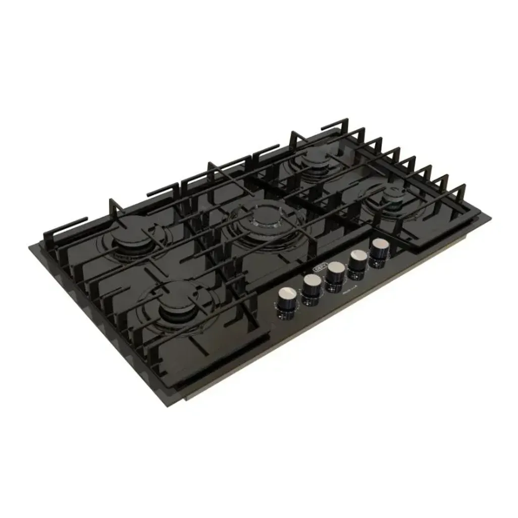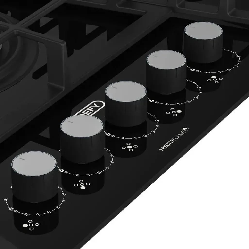 The Defy 90cm Gas On Glass Hob has a black gas-on-glass design. There are 5 gas burners, including a 3.3KW wok burner. This 90cm hob provides a durable support surface for pots and pans to provide a better cooking experience.