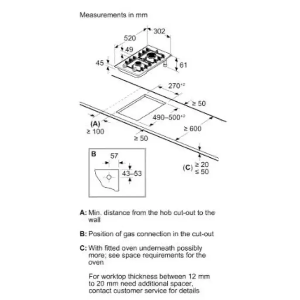 The dimensions for this Siemens 30cm Gas Hob are 45mm x 302mm x 520mm. The required niche size for the installation process is 45mm x 270mm x 490-500mm. This gas hob comes with a 5 year guarantee.