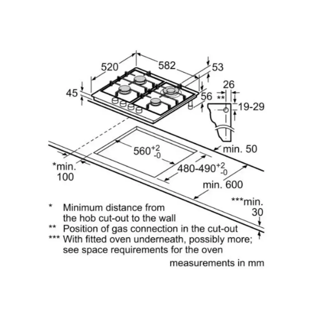 The dimensions for this Siemens 60cm 4 Burner Gas Hob are H 45mm x W 582mm x D 520mm. The required niche size for installation is H 45mm x W 560-560mm x D 480-490mm. The minimum worktop thickness without the spacer is 20mm and with the spacer (not included) 12mm.