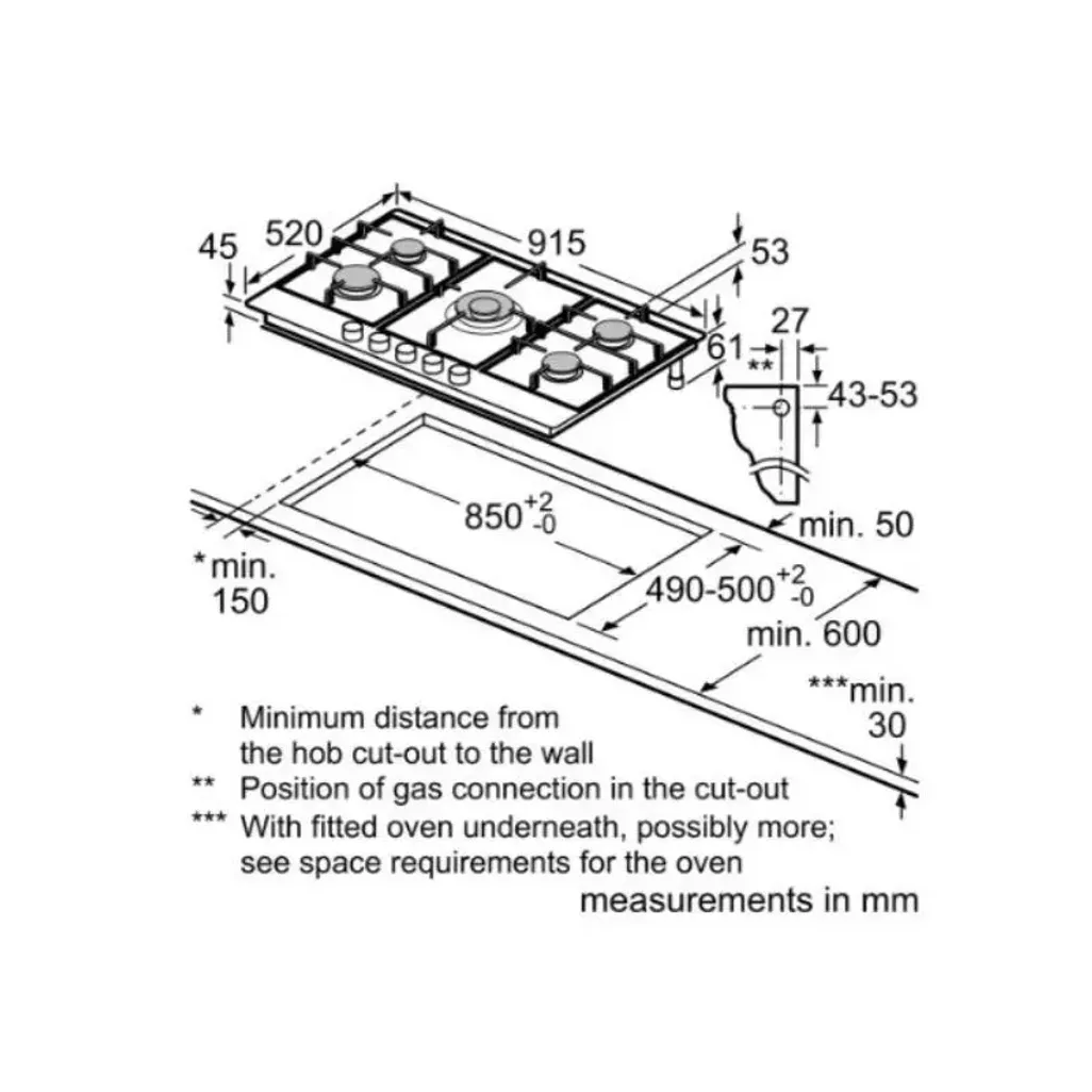 The dimensions for this Siemens 90cm 5 Burner Gas Hob are H 45mm x W 915mm x D 520mm. The required niche size for installation is H 45mm x W 850-850mm x D 490-500mm. The minimum worktop thickness without the spacer is 20mm and with the spacer (not included) 12mm.