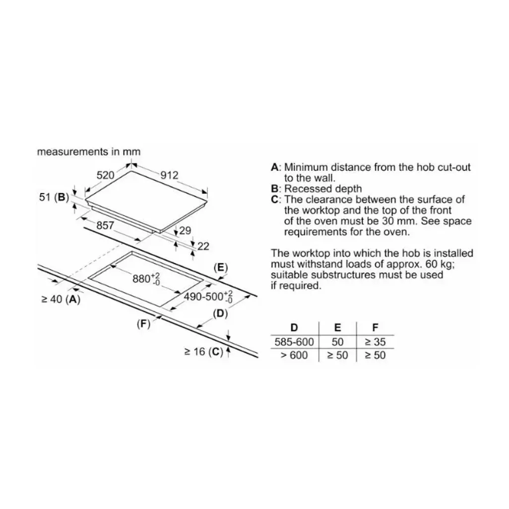 The dimensions for this Siemens 90cm Electric Induction Hob are H 51mm x W 912mm x D 520mm. The required niche size for installation is H 51mm x W 880-880mm x D 490-500mm. Minimum 16mm worktop thickness.