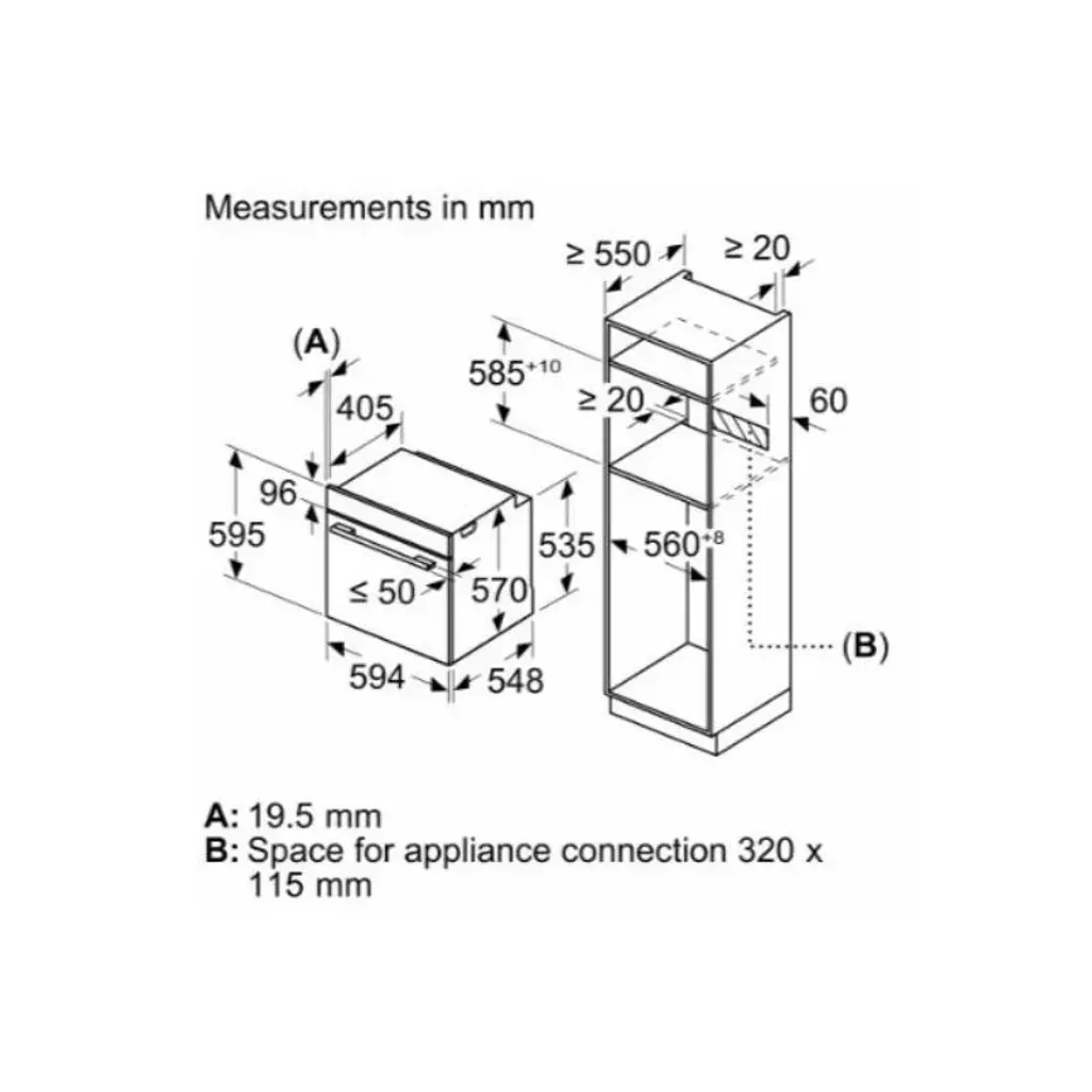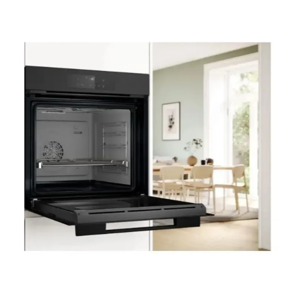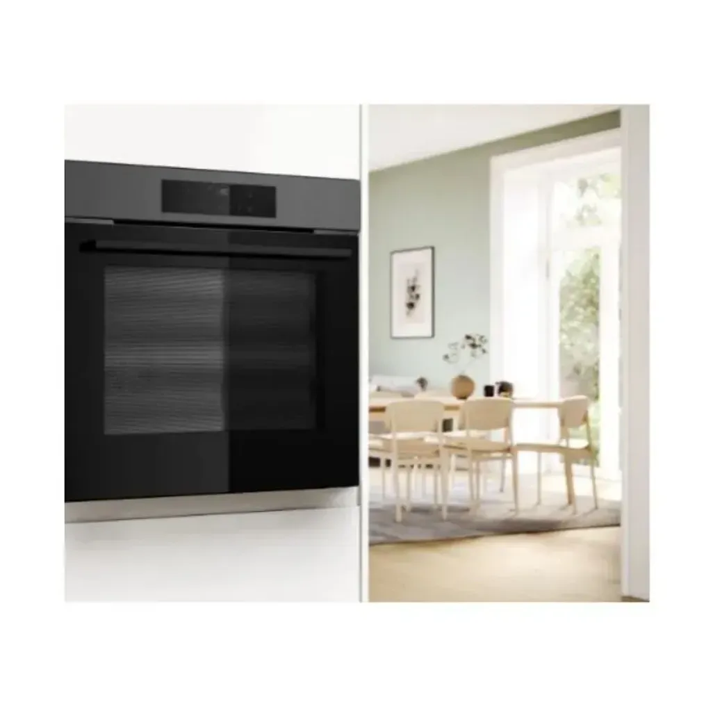 The dimensions for this Bosch 60cm Black Stainless Steel Built-In Oven are H 595mm x W 594mm x D 550mm, and it comes with a 5-year warranty.