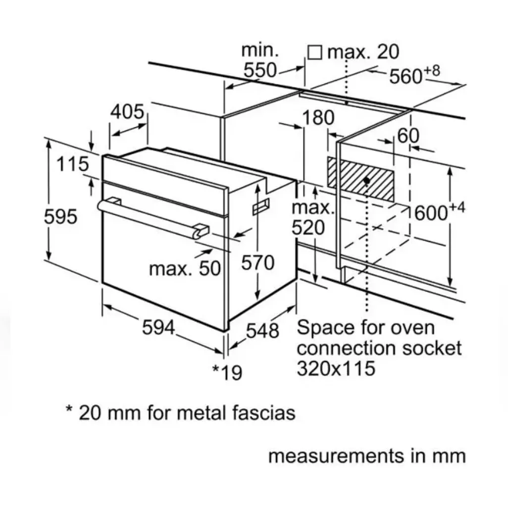 The dimensions of the Bosch 60cm Series 2 Built-In Oven are H 595mm x W 594mm x D 548mm, and this Bosch Oven has a 5-year guarantee.