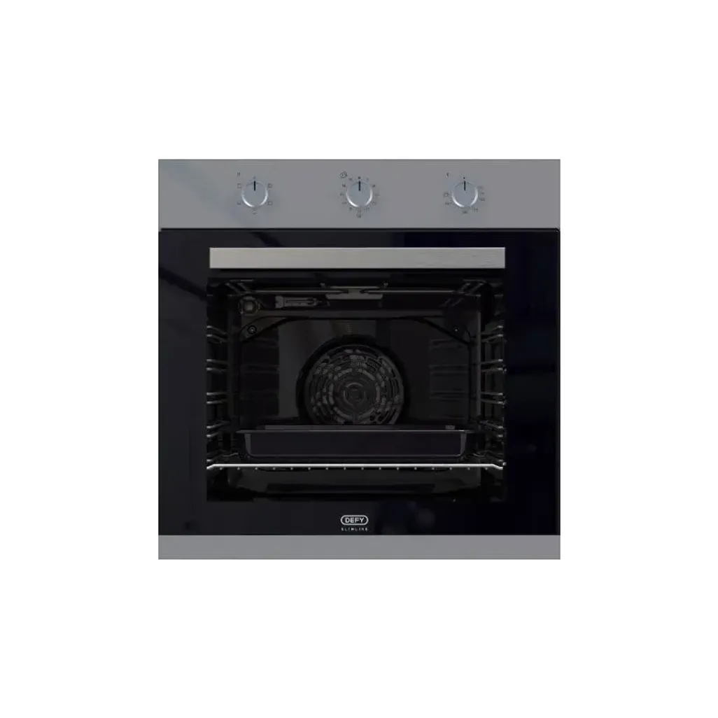 The dimensions of the Defy Slimline Inox Eye-Level Oven are H 595mm x W 595mm x D 570mm. This Defy oven has a 2-year warranty, and you can register for an additional 1-year warranty online.